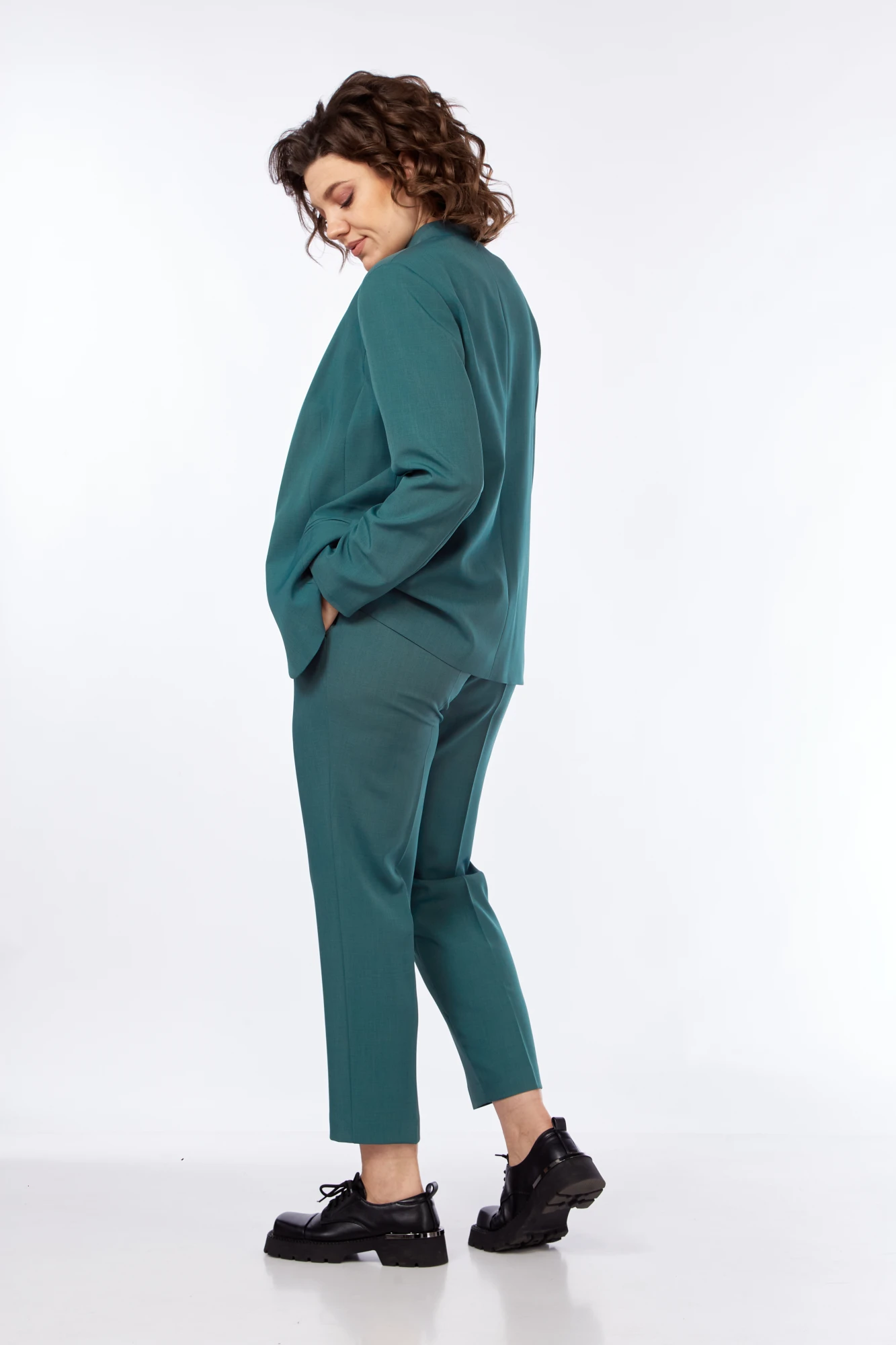 Костюм женский состоящий из жакета и брюк. Жакет полуприлегающего силуэта с центральной бортовой застёжкой на 2 петли-пуговицы до линии перегиба лацкана. Перед с отрезным бочком, талиевой вытачкой и карманом в рамку. Правая часть переда с фигурным лацканом, закреплённым пуговицей. Спинка со средним швом. По переду обработана небольшая цельнокроенная стойка, а по спинке отрезная со средним швом. Рукава втачные двухшовные длинные. Брюки слегка зауженные к низу с притачным поясом сзади на резинке. Застёжка на тесьму-молнию и одну петлю-пуговицу по поясу в среднем шве передних половинок. На изделии обработаны наклонные к боковому шву карманы и заутюжены канты.