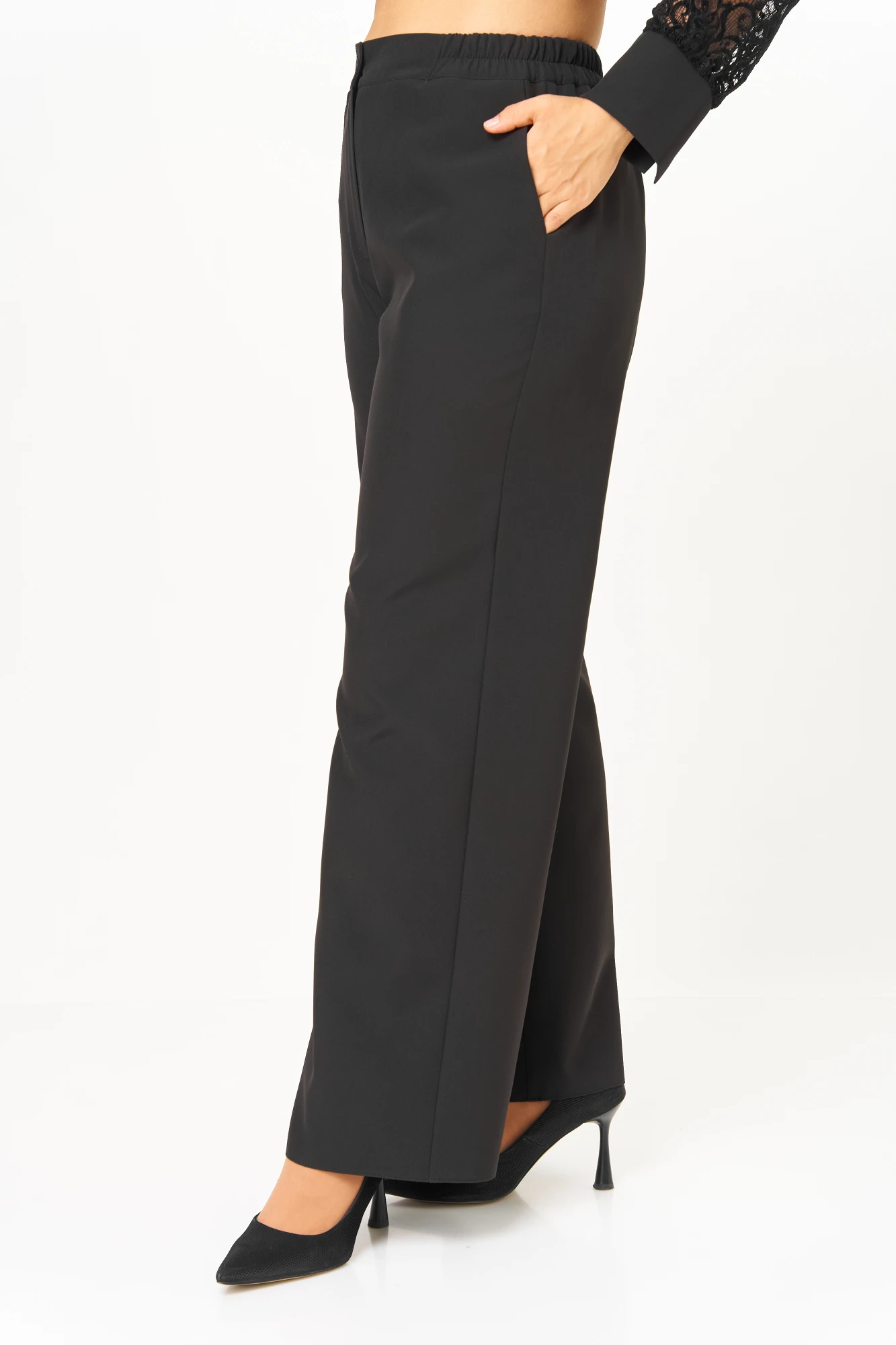 Костюм женский двухпредметный, состоящий из жакета и брюк. Жакет полуприлегающего силуэта, комбинированный с кружевом, спинка и перед на подкладке. Перед с центральной бортовой застежкой на 2 петли-ауговицы и защипом в области талии. Спинка со средним швом и защипами. Рукав из кружева, по низу со сборкой и с притачным манжетом внахлест с разрезом. Горловина V-образной формы, с присборенным кружевом., сходящим на нет и обработанным флешем низом, имитирующим фантазийный воротник. Брюки с притачным поясом сзади на резинке. Классического кроя, расширенные от бедра и до низа (палаццо). Застежка на 2 петли-пуговицы итесьму-молнию. Брюки без заутюженных стрелок.