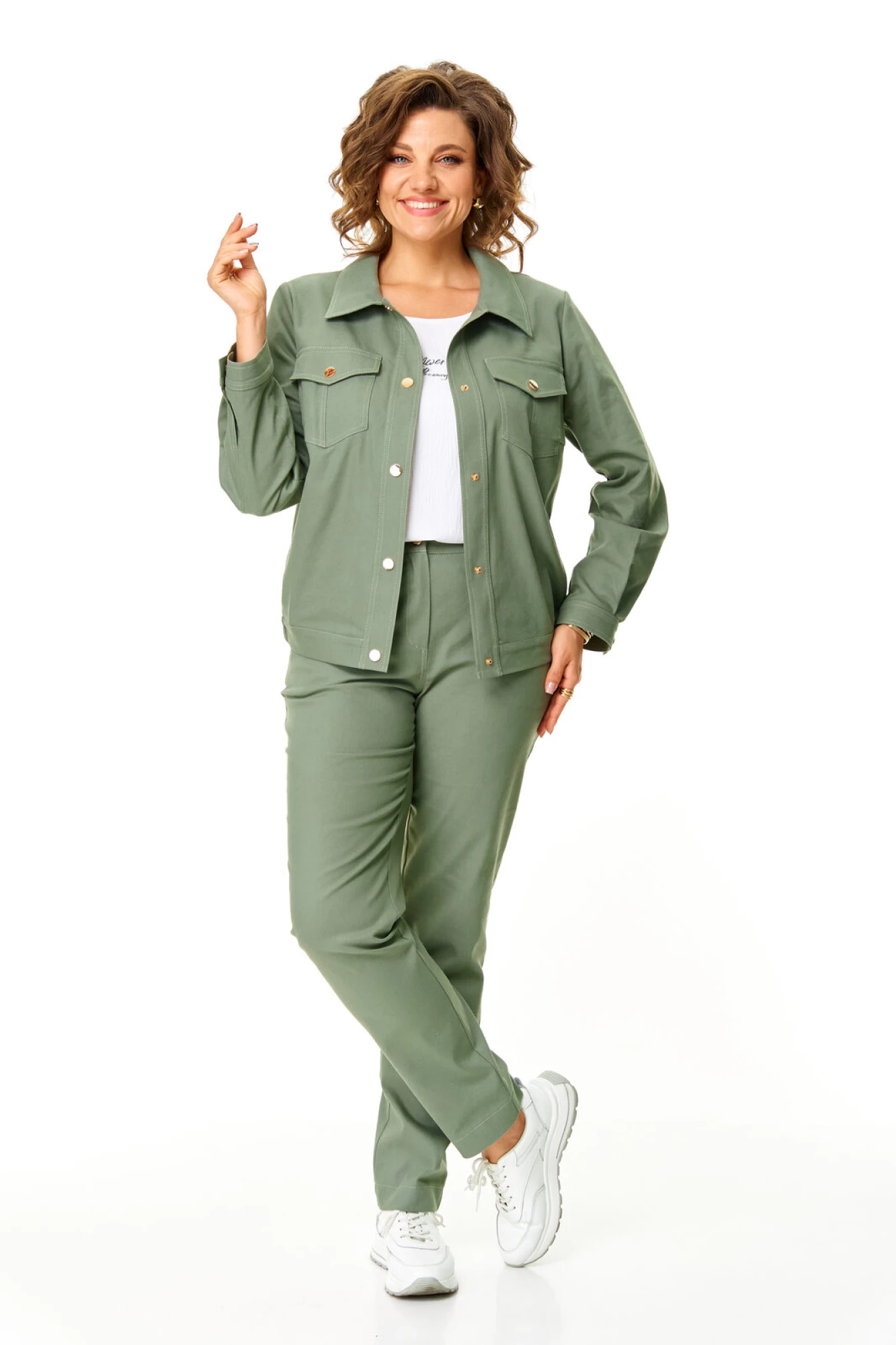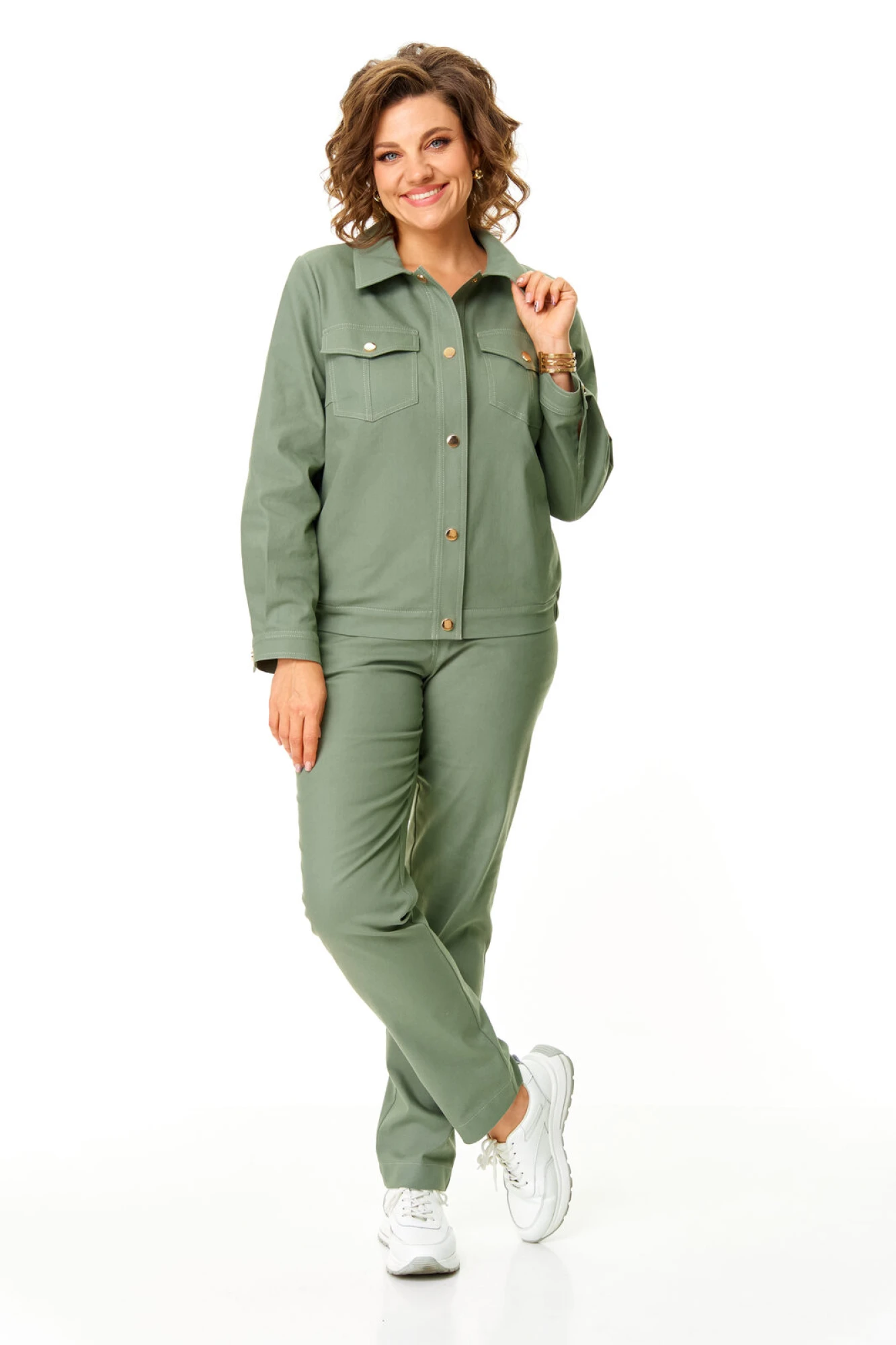 Костюм женский состоит из жакета и брюк. Жакет свободного силуэта с естественной линией плеча.Перед с отрезной планкой и центральной бортовой застежкой на золотые кнопки.По спинке выполнены кокетка и рельефы.По переду имеются накладные карманы авторской формы с клапанами.В боковых швах карманы.Воротник отложной.Рукав длинный с защипами по низу и патой.Низ рукава обработан притачной манжетой с застежкой на золотую кнопку.Низ жакета обработан притачным поясом с резинкой по спинке и некоторой части переда.Брюки зауженные к низу, с центральной застёжкой на молнию и петлю-пуговицу.В боковых швах карманы с отрезным бочком.Пояс притачной с резинкой по бокам.Отделочные строчки контрастного цвета.Вся фурнитура металлическая premium качества.