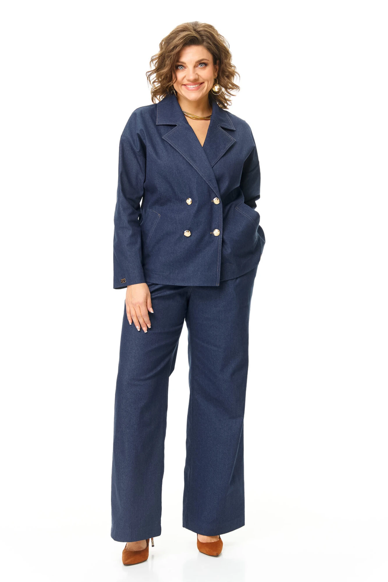 "Комплект женский состоит из жакета и брюк. Жакет прямого свободного покроя со спущенной линией плеча.Застежка двубортная на золотые пуговицы.Воротник отложной пиджачного типа.