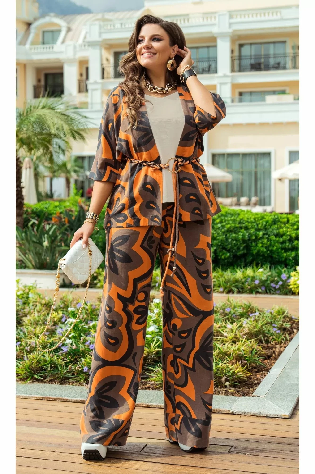 Брючный костюм Vittoria Queen 20713/1 дизайн цветы/оранжевый+беж тройка