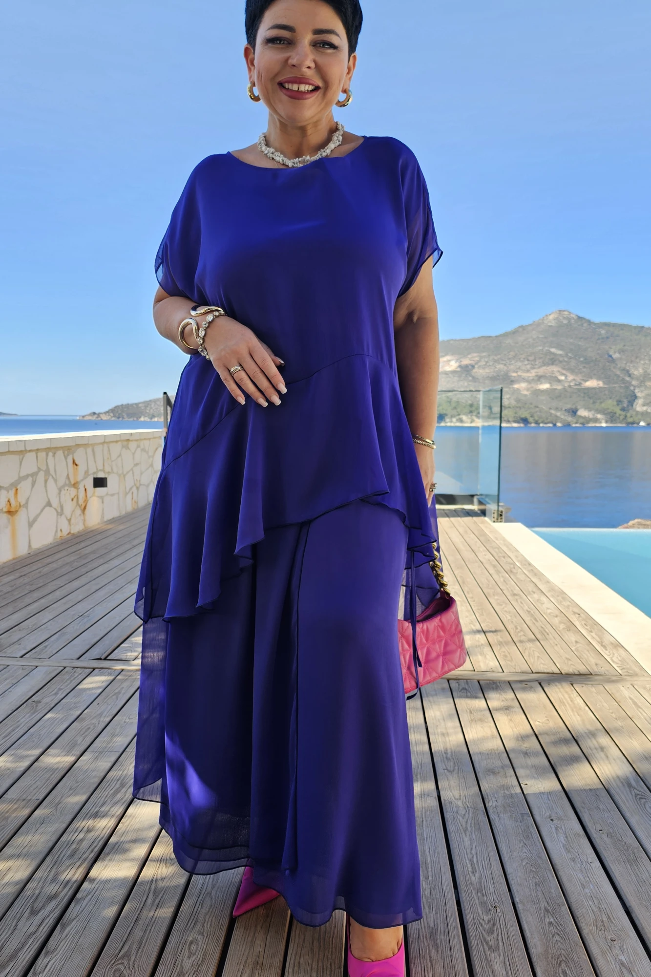 Ярко-фиолетовый костюм состоящий из блузки и широких брюк, из крешованного шифона -словно олицетворяет утончённую элегантность и лёгкость. Этот великолепный наряд привлекает внимание своей необычной текстурой, которая придаёт образу особое очарование. Тонкий, почти незаметный крешованный эффект шифона придаёт изделию объём и воздушность, создавая впечатление лёгкости и невесомости на теле.