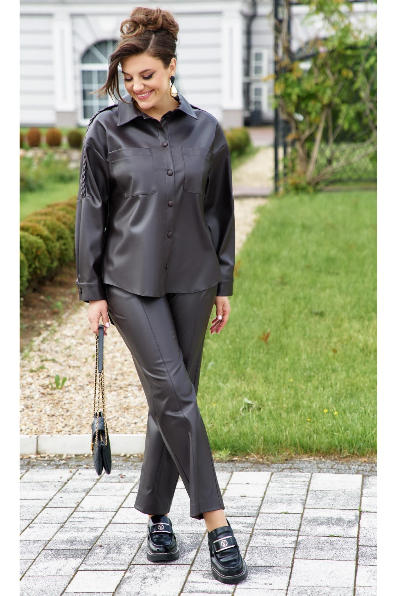 Костюм женский, двух-предметный состоящий из рубашки и брюк. Глубокий, почти съедобный оттенок шоколадной кожи манит теплом и благородством, словно осенний вечер у камина. Этот костюм — идеальный баланс между уютной мягкостью и дерзкой структурой, между свободой oversize и чёткостью линий. Рубашка— не просто верх, а главный акцент. Кожа, плотная, но податливая, образует «оверсайз» силуэт, в котором легко затеряться, но при этом выглядеть безупречно. Плечо, от места втачивания воротника и до вытачки по рукаву, украшены декоративными косичками из кожаных тесёмок. Они добавляют текстуру, напоминая элементы авангардного плетения. По переду рубашки застёжка на декоративные пуговицы в тон ткани по планке, и накладные карманы. Воротник рубашечного типа. Линия плеча спущенная. Спинка в рубашке с отрезной кокеткой. Рукав втачной, длинный с локтевым швом и разрезом от низа; заложенной складкой от низа и притачной манжетой. Низ в рубашке ассиметричный. Брюки прямого силуэта из кожи с рельефами и отстрочкой по переду. По переду застежка на тесьму молнию в гульфике и пуговицу в поясе. По переду брюк наклонные карманы. Пояс притачной со вставкой эластичной тесьмы резинки в «бочках», что обеспечивает комфортную посадку на фигуру. Мягкая, но плотная кожа облегает фигуру, не стягивая её, а лишь подчёркивая женственные изгибы, добавляют образу элегантной строгости.