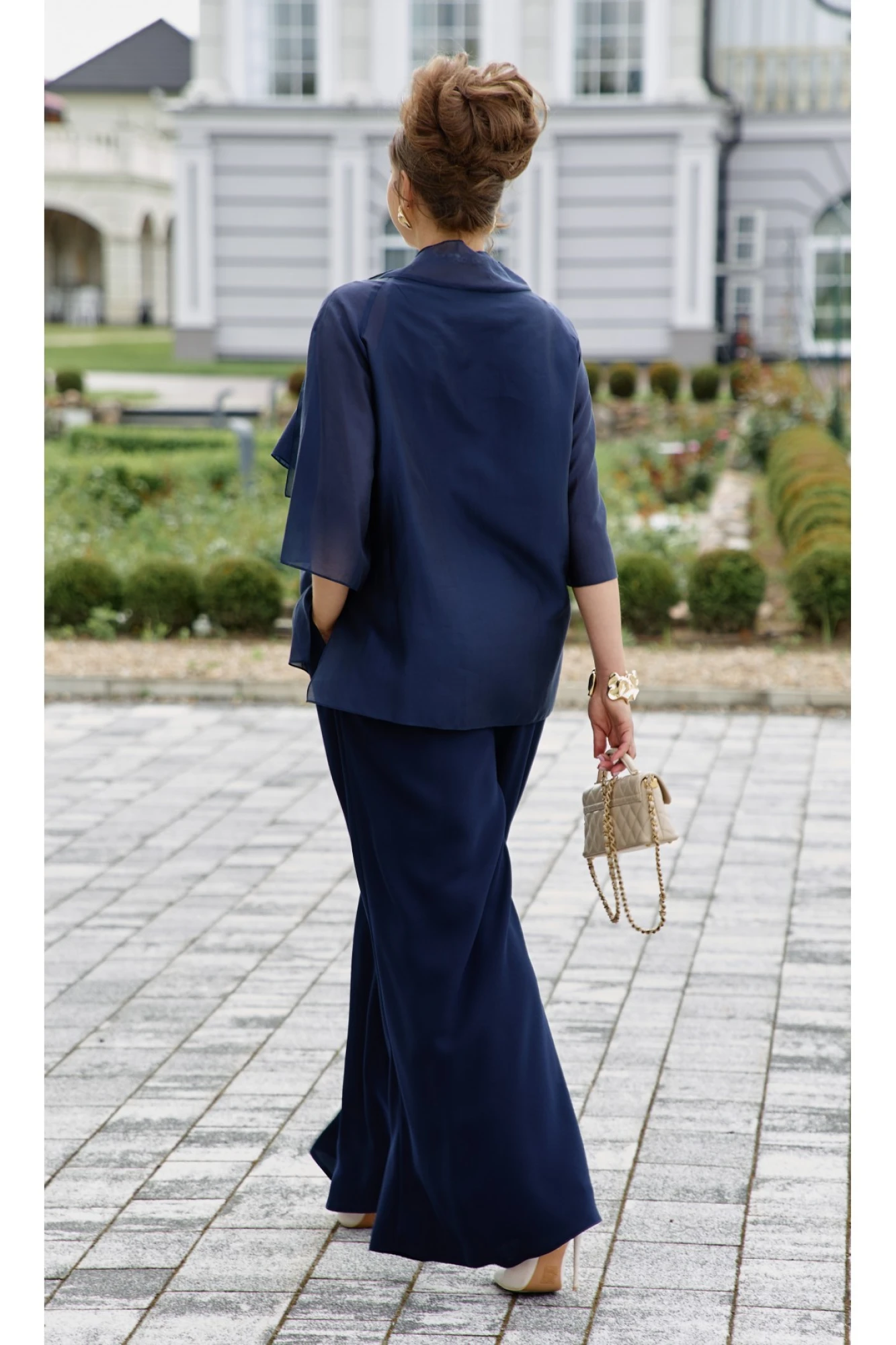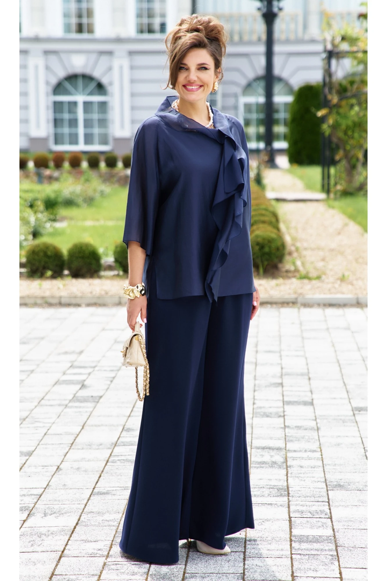 Представляем вашему вниманию элегантный брючный костюм, выполненный в мерцающем оттенке, который идеально подходит для создания утонченных образов. Комплект состоит из свободной блузы широких брюк палаццо, обеспечивая непревзойденный комфорт и легкость движений. Состав: брюки 100% пэ, блуза 85% лиоцелл, 15% пэ. Блузка привлекает внимание своим асимметричным дизайном с драпировками и широким, ниспадающим воротником, который придает образу динамичность и изысканность. Блуза свободного силуэта, с двойными деталями переда и спинки. Головина округлой формы. Рукав в блузе реглан, длиной ¾, что добавляет силуэту легкости и воздушности, подчеркивая утонченность образа. В боковых швах блузы разрезы. Брюки с высокой посадкой и струящимся кроем визуально удлиняют ноги, создавая безупречный и гармоничный ансамбль. Этот костюм идеально подходит как для торжественных мероприятий, так и для деловых встреч, подчеркивая ваш безупречный вкус и чувство стиля. Он станет незаменимым элементом гардероба современной женщины, ценящей комфорт, элегантность и актуальные тенденции. Пояс в брюках притачной с эластичной тесьмой-резинкой, что обеспечивает максимально удобную посадку на любой тип фигуры. В боковых швах брюк карманы.