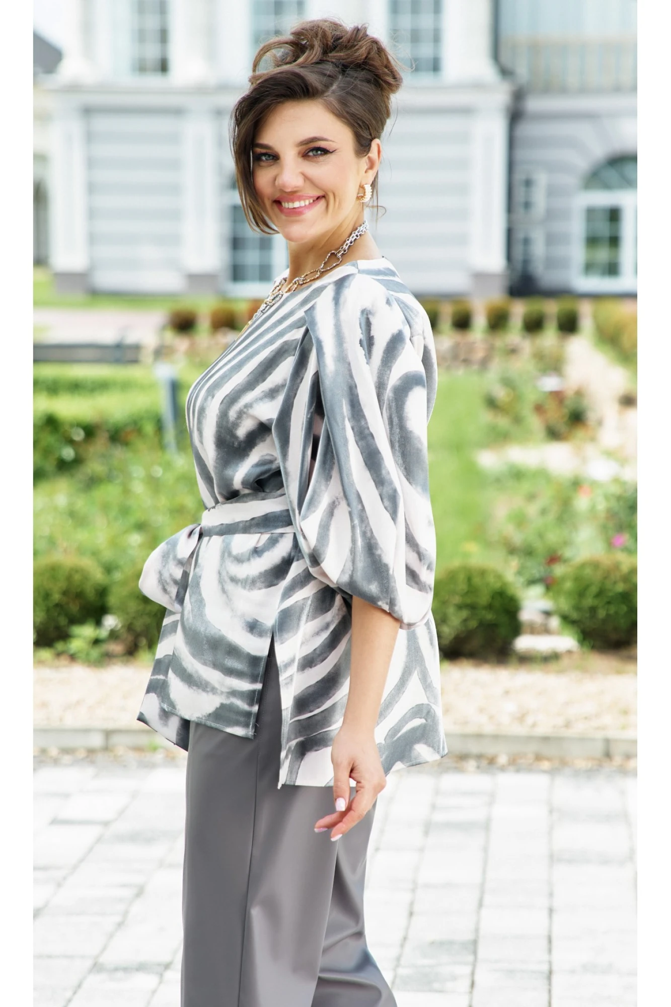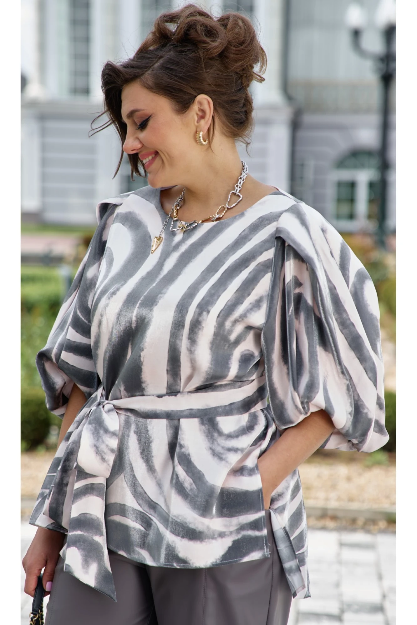 Комплект женский, двух-предметный, состоящий из блузки и брюк. Стильный и изысканный женский комплект идеален для торжественных мероприятий, станет жемчужиной вашего гардероба. Комплект можно дополнить лаконичными босоножками на каблуке или ботильонами, минималистичными украшениями они подчеркнут утончённость, а мягкий клатч пастельного оттенка завершит этот элегантный, но уверенный образ. Блуза (состав: 61% район, 39% вискоза) будто написана кистью: размытые мазки пудрово-серого оттенка создают ощущение лёгкой дымки. Ткань с тонким шёлковым блеском мерцает при движении. Блуза свободного силуэта с вырезом горловины в виде «лодочки». Спинка без особенностей. Низ ассиметричный с разрезами в боковых швах от низа. Рукав в блузе втачной на подкладке, в виде буфа, с залаженными декоративными складками по окату и низу. В комплекте идёт пояс из основной ткани. Брюки (состав: 60% полиэстер, 40% полиуретан) прямого силуэта из кожи с рельефами и отстрочкой по переду. По переду застежка на тесьму молнию в гульфике и пуговицу в поясе. По переду брюк наклонные карманы. Пояс притачной со вставкой эластичной тесьмы резинки в «бочках», что обеспечивает комфортную посадку на фигуру. Мягкая, но плотная кожа облегает фигуру, не стягивая её, а лишь подчёркивая женственные изгибы, добавляют образу элегантной строгости.