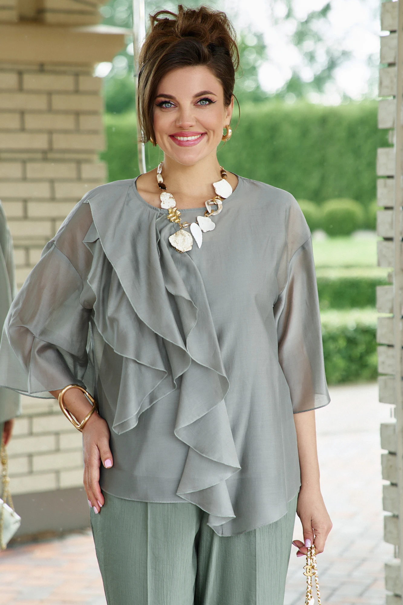 Комплект женский, состоящий из верхней блузы, нижней блузы и брюк. Вуалирующая прозрачность блузы, скрывает несовершенства фигуры, и создает идеальный силуэт, а брюки из ткани с «жатой» фактурой стройнят и вытягивают силуэт. Верхняя блуза свободного силуэта с округлой формой горловины. Линия плеча спущенная. Рукав втачной, длинной ¾ с декоративным защипом. Спинка без особенностей. Низ в блузе ассиметричный с разрезами в боковых швах. Главным акцентом блузы являются отделочные вставки в подрезе в виде рюш. Нижняя блуза свободного силуэта, с округлой формой горловины, нагрудными вытачками по переду блузы. Спинка без особенностей. В боковых швах разрезы. Брюки прямого силуэта со стрелками по переду. Пояс в брюках притачной с эластичной тесьмой-резинкой, которая обеспечивает максимально удобную посадку на любой тип фигуры.Длина блузы по центру спинки 76,5 см (р 50-54), 77 см (р 56-60), длина рукава по короткой/длинной стороне 37/45 см. Длина брюк по боковому шву от шва притачивания пояса 98 см.