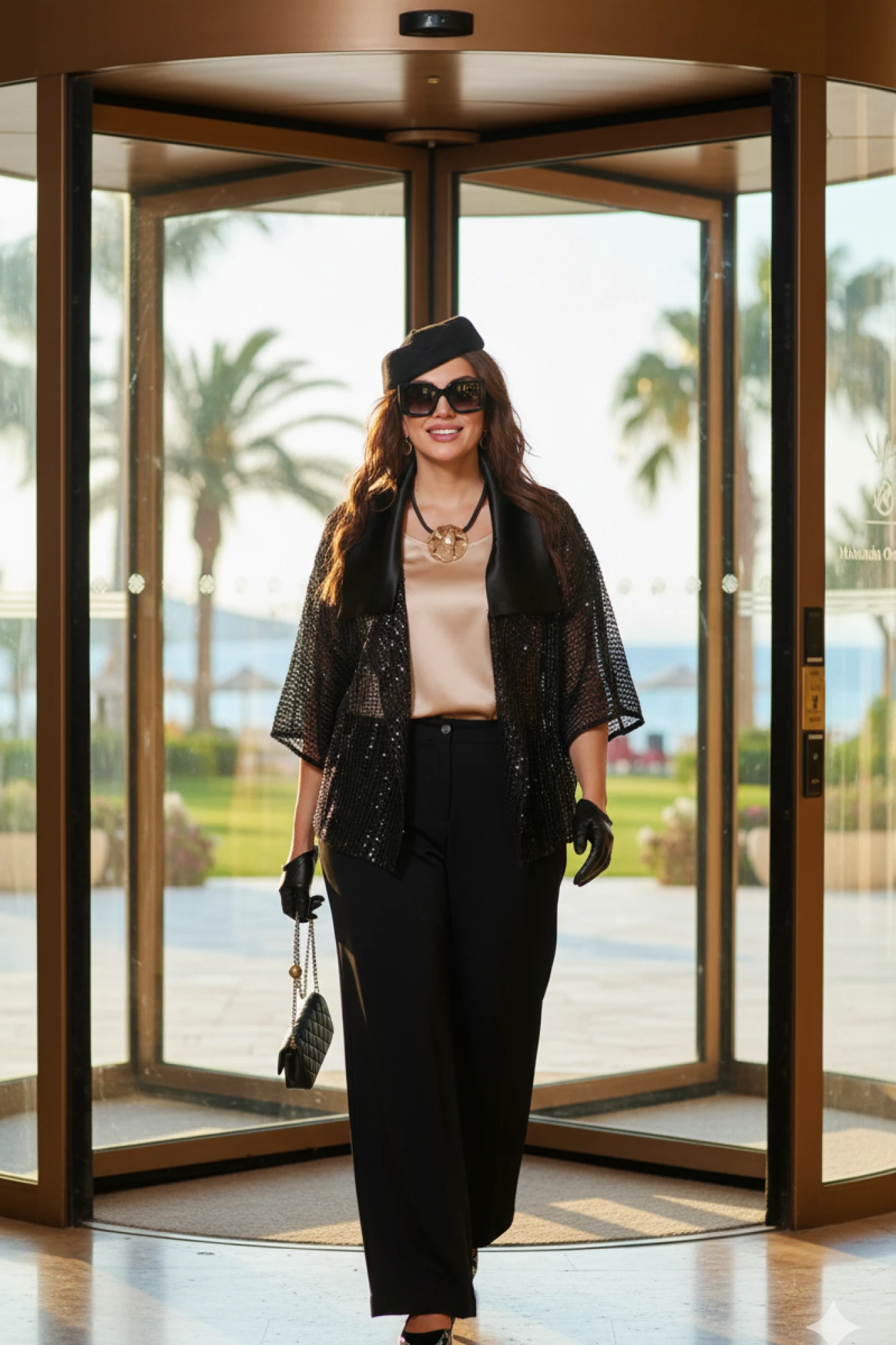 Комплект женский брючный, состоящий из жакета, блузы и брюк. Если Вы ищете идеальное сочетание стиля и комфорта, вот идеальный выбор. Мы специально подобрали качественную и тактильно приятную ткань, которая хорошо держит свою форму, создавая ощущение легкости и свободы движения. Стильный комплект - лучший выбор для тех, кто не боится самовыражаться и приковывать к себе взгляды окружающих. Оригинальный асимметричный крой, помноженный на пластические свойства ткани подчеркнет все, что нужно подчеркнуть, и скроет все, что нужно скрыть.Жакет ( состав: 100% полиэстер) продолжает линию плеча и свободно свисает до середины бедра, образуя мягкую, расслабленную форму. Это не просто вещь, а диалог материалов: матовая глубина сетки и искрящийся блеск пайеток соединяются с атласным воротнико, создавая ансамбль, который легко адаптируется под вечерний выход. Жакет «оверсайз» силуэта с ассиметричной линией борта, отложным воротником из отделочной ткани. Линия плеча в жакете спущенная. Рукав втачной, длиной ¾. Спинка без особенностей. Жакет на подкладке.Блуза (состав: 97% полиэстер, 3 % спандекс) в благородном золотом оттенке, который гармонично сочетается с насыщенным чёрным цветом комплекта. Блуза прямого силуэта с округлой формой горловины и нагрудными вытачками по полочке. Спинка без особенностей. Низ в блузе фигурной формы.Брюки (состав: 97% полиэстер, 3 % спандекс) прямого силуэта, длинные. Пояс в брюках притачной на эластичной тесьме-резинке. По переду брюк прорезные карманы.