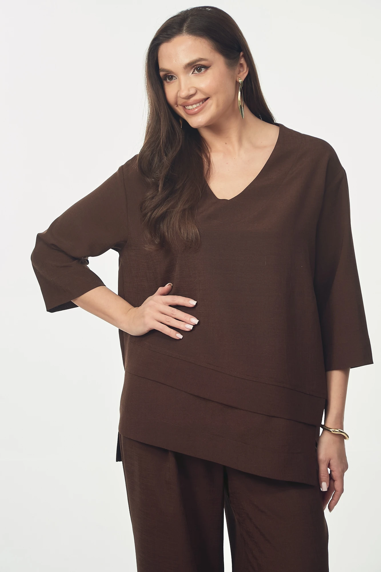 Костюм-двойка состоит из блузы прямого силуэта и широких брюк. Блуза имеет стильный V-образный вырез горловины и оригинальный дизайн с асимметричной многослойной баской по переду. Рукав втачной со спущенным плечом. Длина рукава с плечом для роста 164 см 54 см, для роста 170 см 57см. Брюки широкие от бедра. На передних и на задних половинках брюк карманы «листочки» и глубокая складка спереди. Пояс притачной на резинке по задней части. Застегиваются на «гульфик» и пуговицу. Длина брюк от линии талии для роста 164 см 108 см, для роста 170 см 111 см. Этот элегантный женский брючный костюм свободного силуэта, выполненный в глубоком шоколадном цвете, идеально подойдет как для деловых встреч, так и для торжественных мероприятий.