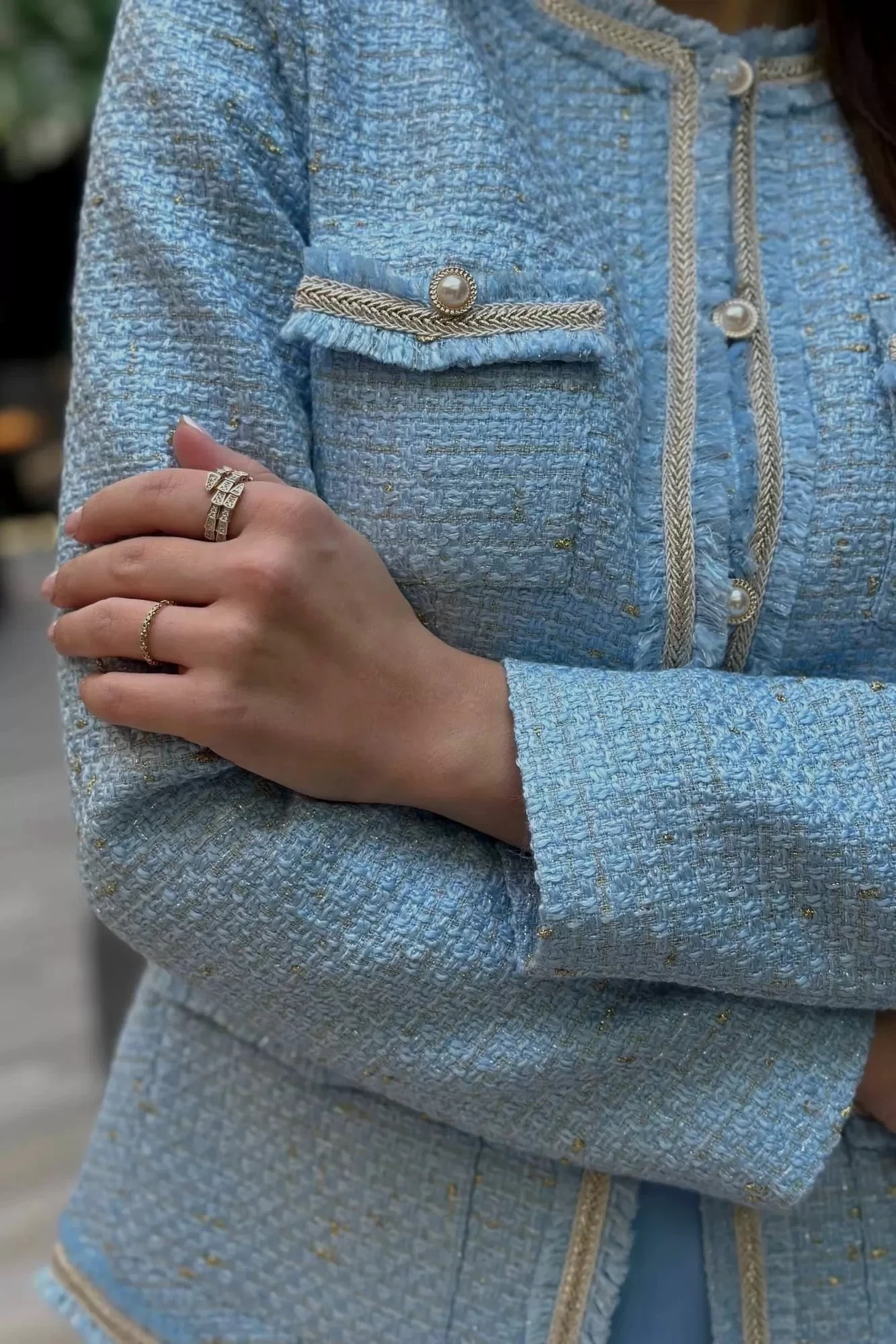 Жакет женский из костюмно-плательной ткани в стиле “Шанель” на подкладке, с центральной бортовой застежкой встык на 4 навесных петли и пуговицы (размер и цвет фурнитуры может незначительно отличаться от фото). Перед жакета с талиевой вытачкой, идущей от низа изделия до центра груди. На переде расположены 2 пары накладных карманов с клапанами, вверху на уровне линии груди и немного ниже линии талии, на клапанах пришиты пуговицы (декоративный элемент). Углы кармана прямые, клапаны фигурной формы. Спинка со средним швом и талиевыми вытачками. Рукава втачные двухшовные, длинные. Горловина круглой формы, обтачная. Линия борта прямая. Край горловины, борт, клапаны и низ изделия оформлен бахромой и отделочной тесьмой. Жакет с плечевыми накладками.