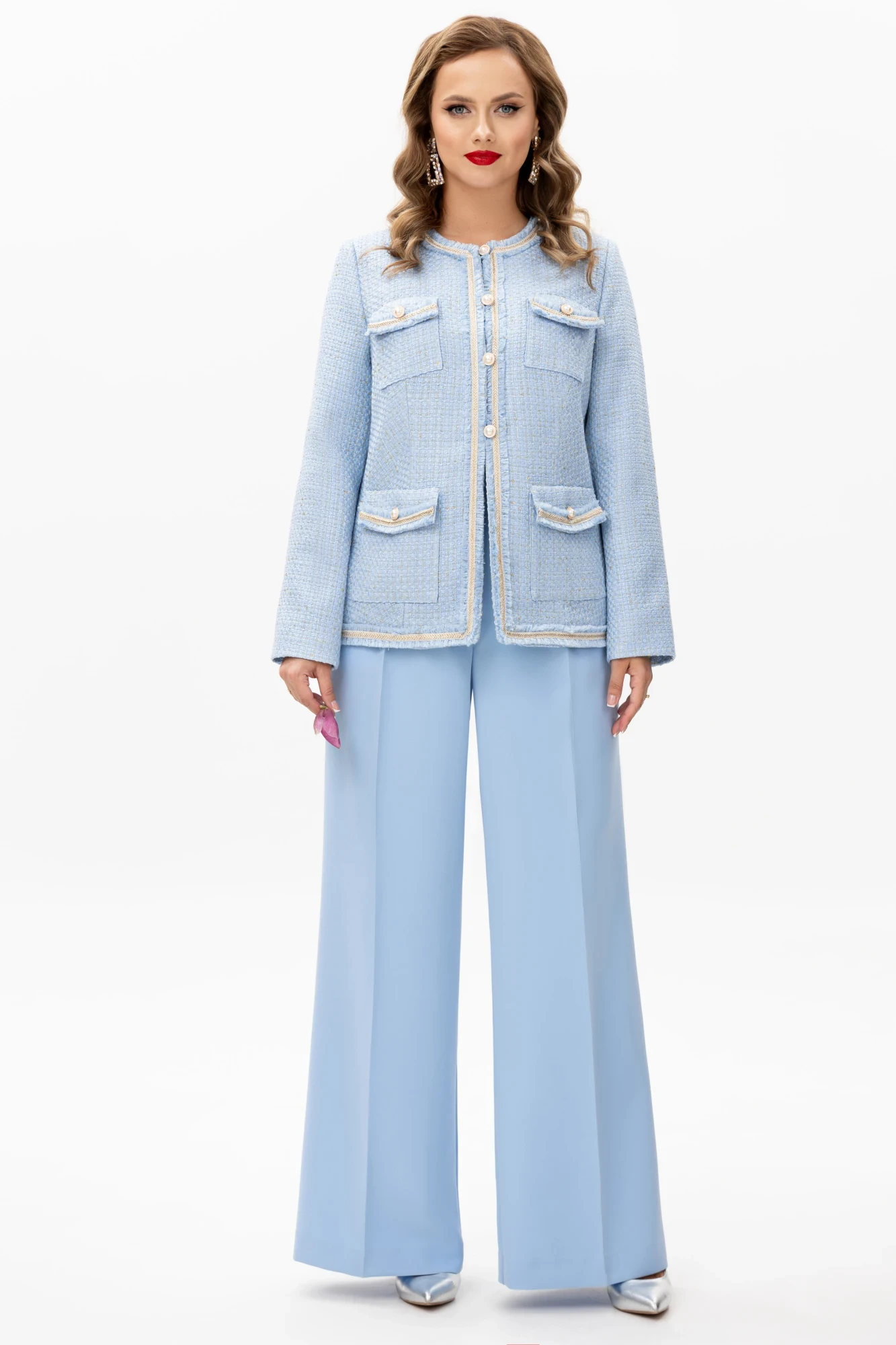 Элегантный костюм из твидового жакета и широких брюк – идеальный выбор для современных женщин. Изготовлен из качественного твида, костюм подчеркивает Ваш статус и прекрасный вкус. Жакета и золотые пуговицы идеально сочетаются с широкими брюками, создавая гармоничный образ. Комплект женский, состоит из жакета полуприлегающего силуэта и брюк.