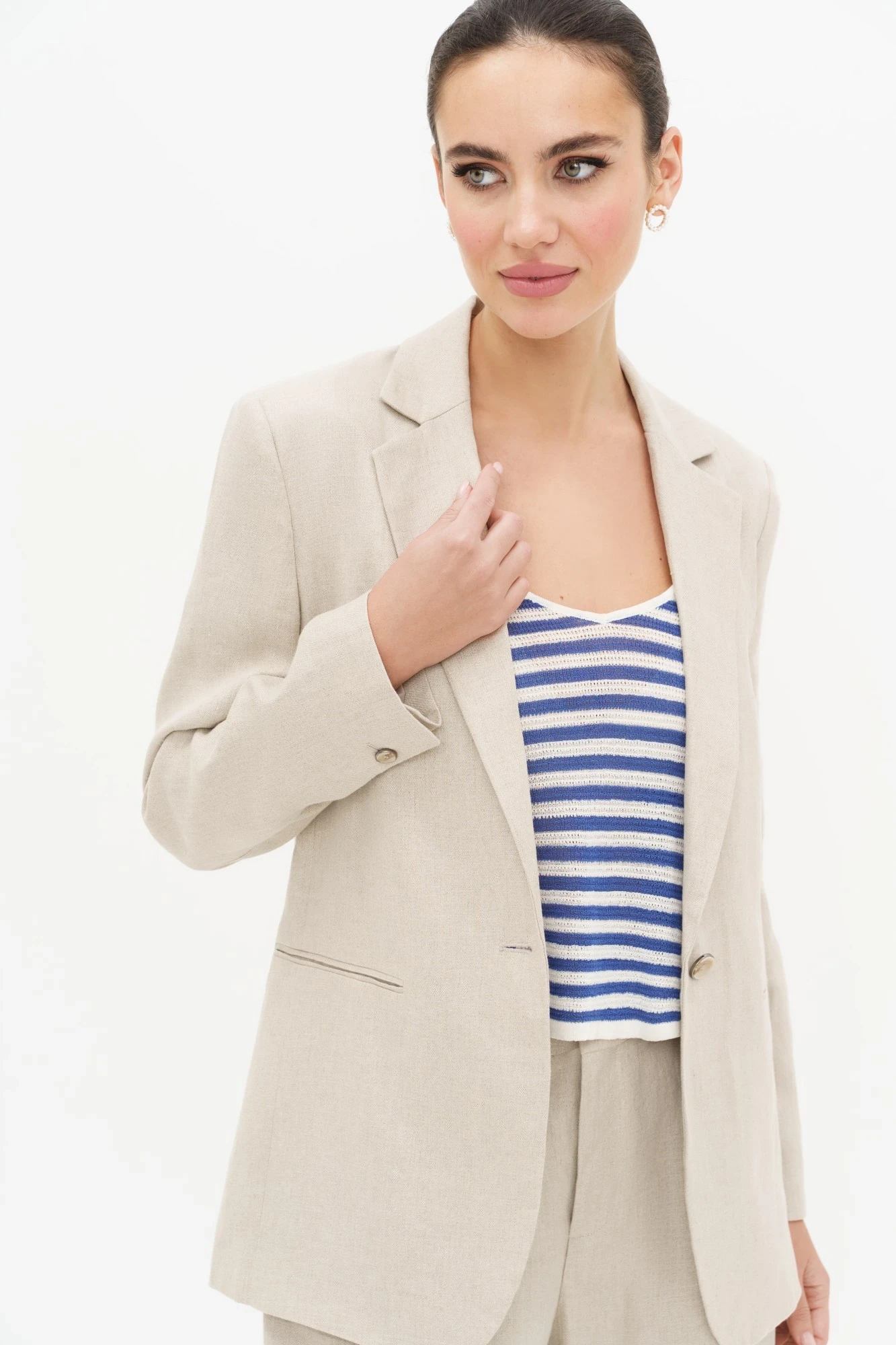 Элегантный женский брючный костюм выполнен из высококачественной льняной ткани в бежевом цвете. Этот оттенок символизирует спокойствие, гармонию и комфорт, что делает его идеальным выбором для делового гардероба.