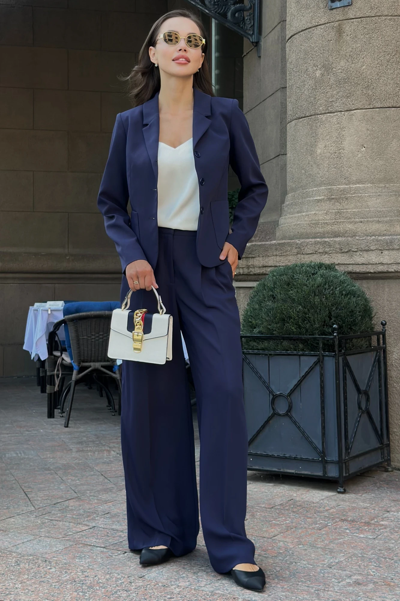 46:Длина спинки (вдоль середины спинки от шва втачивания воротника до низа) - 57,5 см (±1,5 см), Ширина изделия на уровне глубины проймы - 51,5 см (±1,0 см), Ширина изделия по линии талии - 47,5 см (±1,0 см), Ширина изделия по линии бедра - 55,0см (±1,0 см), Длина рукава - 61,0 см (±1,0 см), Ширина рукава вверху - 18,0 см (±1,0 см), Ширина рукава по низу - 13,0см (±0,5см), Длина плеча - 12,2 см (±0,5 см). Длина брюк по боковому шву с поясом- 112,5см (±3,0 см). Ширина пояса 5,0 см (±0,5 см). Длина брюк по боковому шву без пояса- 107,5см (±3,0 см). Ширина брюк на уровне линии талии( по середине пояса)- 43,0см (±1,0 см), Ширина брюк на уровне линии бедер - 55,0см (±1,0 см), Ширина брюк по низу- 32,5 (±1,0 см).