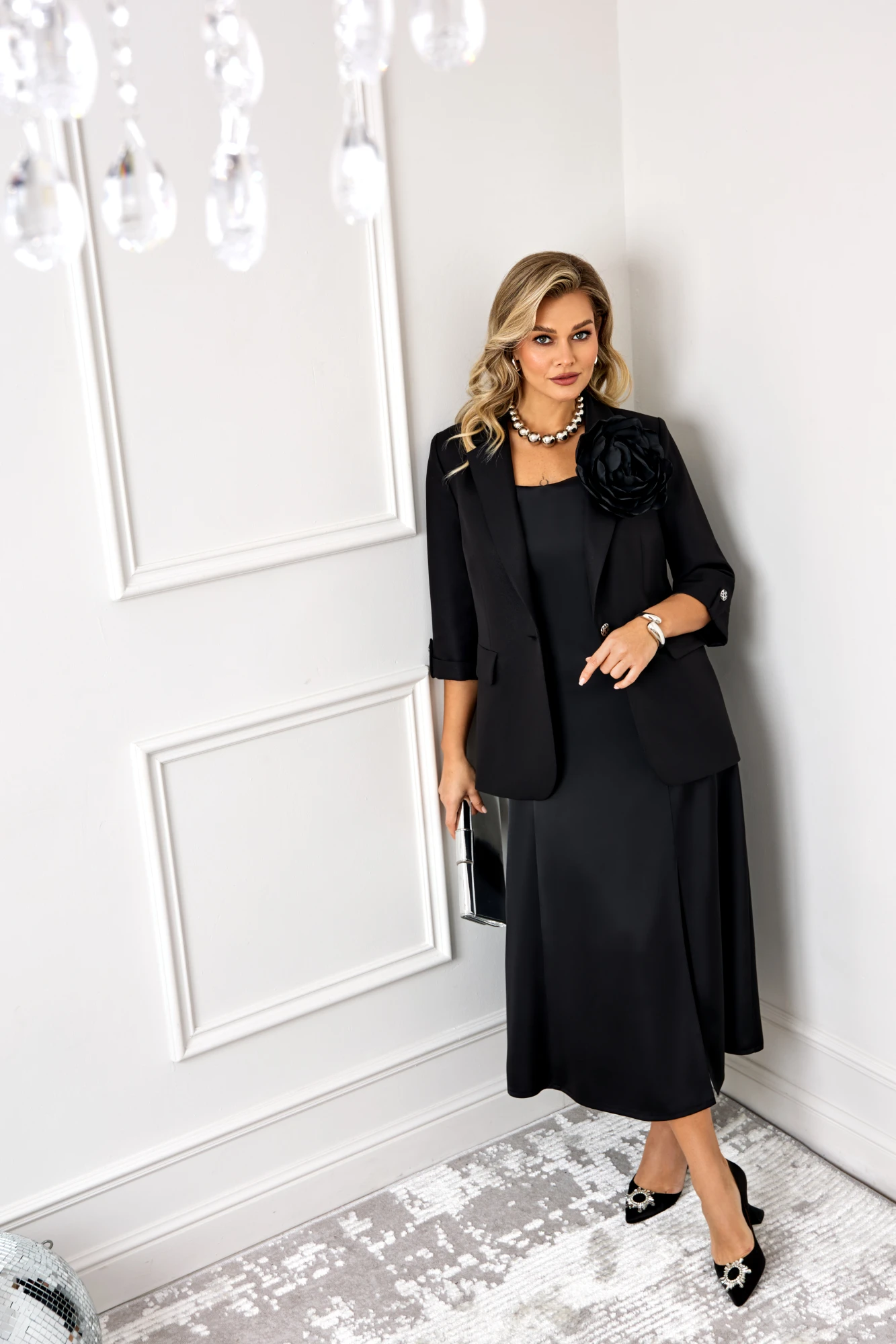Элегантный и нарядный комплект, состоит из жакета и платья. Жакет прямого силуэта, выполнен из Ткани Барби с добавлением вискозы, полностью на подкладке. Жакета по переду с застежкой на пуговицу, функциональными карманами с клапанами. Рукав втачной, длиной ¾, с манжетой и патой с застежкой на пуговицу. Спинка жакета по низу со шлицей. Жакет декорирован съемным украшением в виде банта ручной работы. Платье А-силуэта, выполнено из атласной ткани с добавляем вискозы. Платье на бретелях, спереди с разрезом, что придает модели особый шарм. Модель удобная и практичная, отлично подойдет для ежедневной носки и торжественного мероприятия.