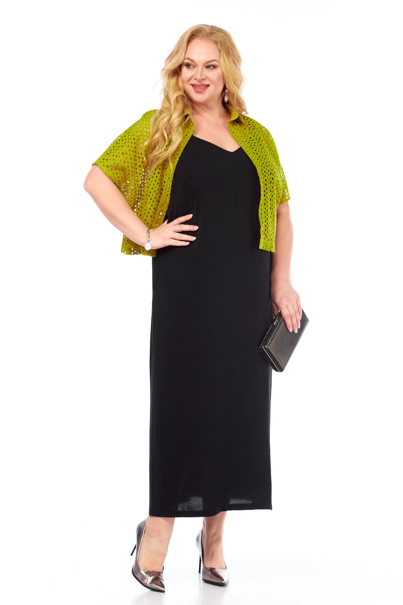 Комплект женский состоит из блузона и сарафана. Сарафан полуприлегающего силуэта, на бретелях, со средним швом на спинке, который заканчивается разрезом. По переду нагрудные вытачки, в боковых швах обработаны карманы. Блузон свободного кроя со спущенной линией плеча. Без застежки. Воротник стояче-отложной с отрезной стойкой. Внутренние срезы окантованы.