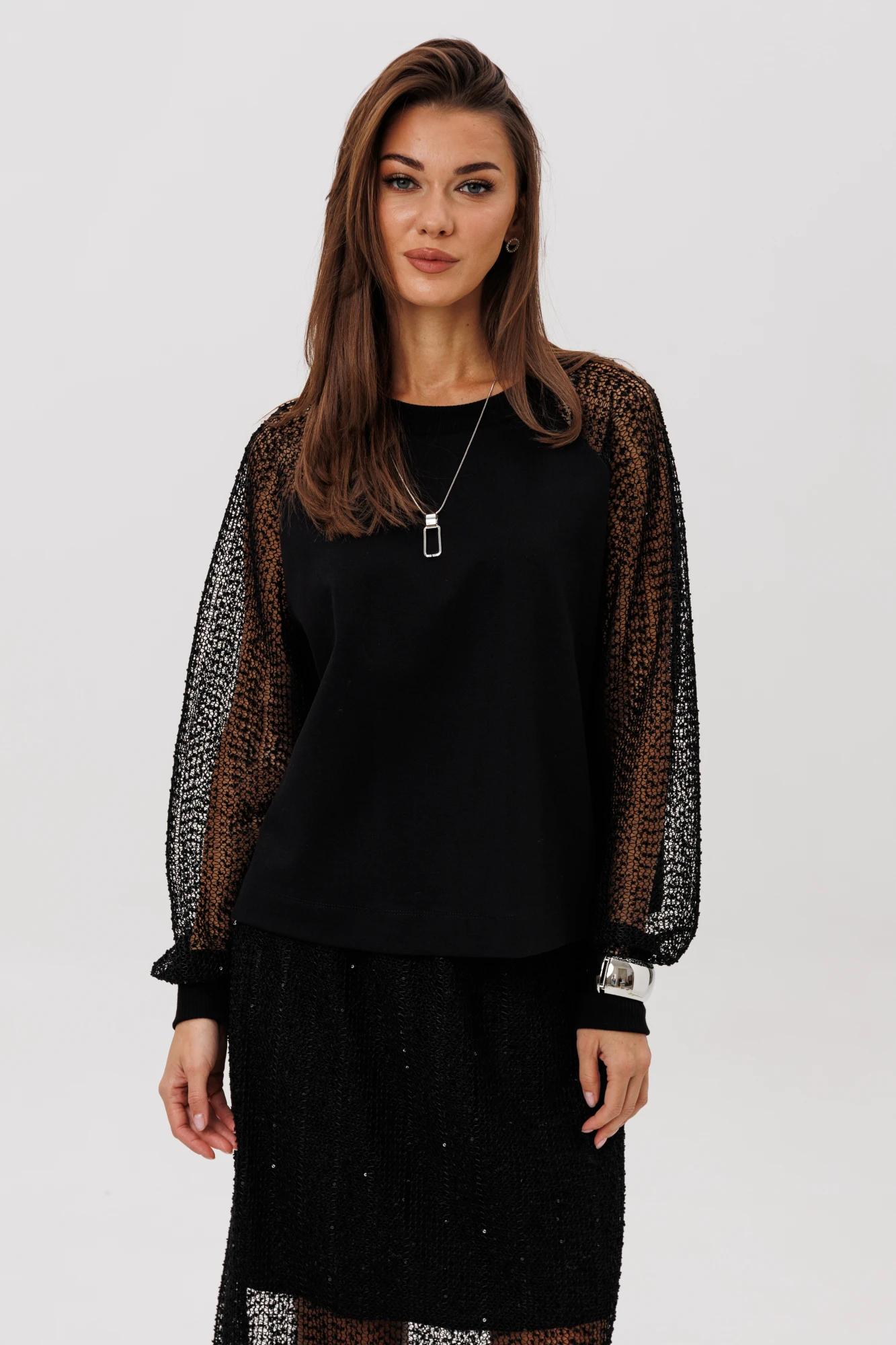 Элегантный юбочный комплект, созданный для тех, кто ценит сочетание комфорта и эффектного стиля. Верх выполнен из мягкого, комфортного вискозного полотна с нейлоном, приятного к телу и отлично удерживающего форму. Лёгкая воздушность образу придают полупрозрачные мерцающие рукава, выполненные из сетки с вкраплением микропайетки — они создают утончённую игру света при движении.