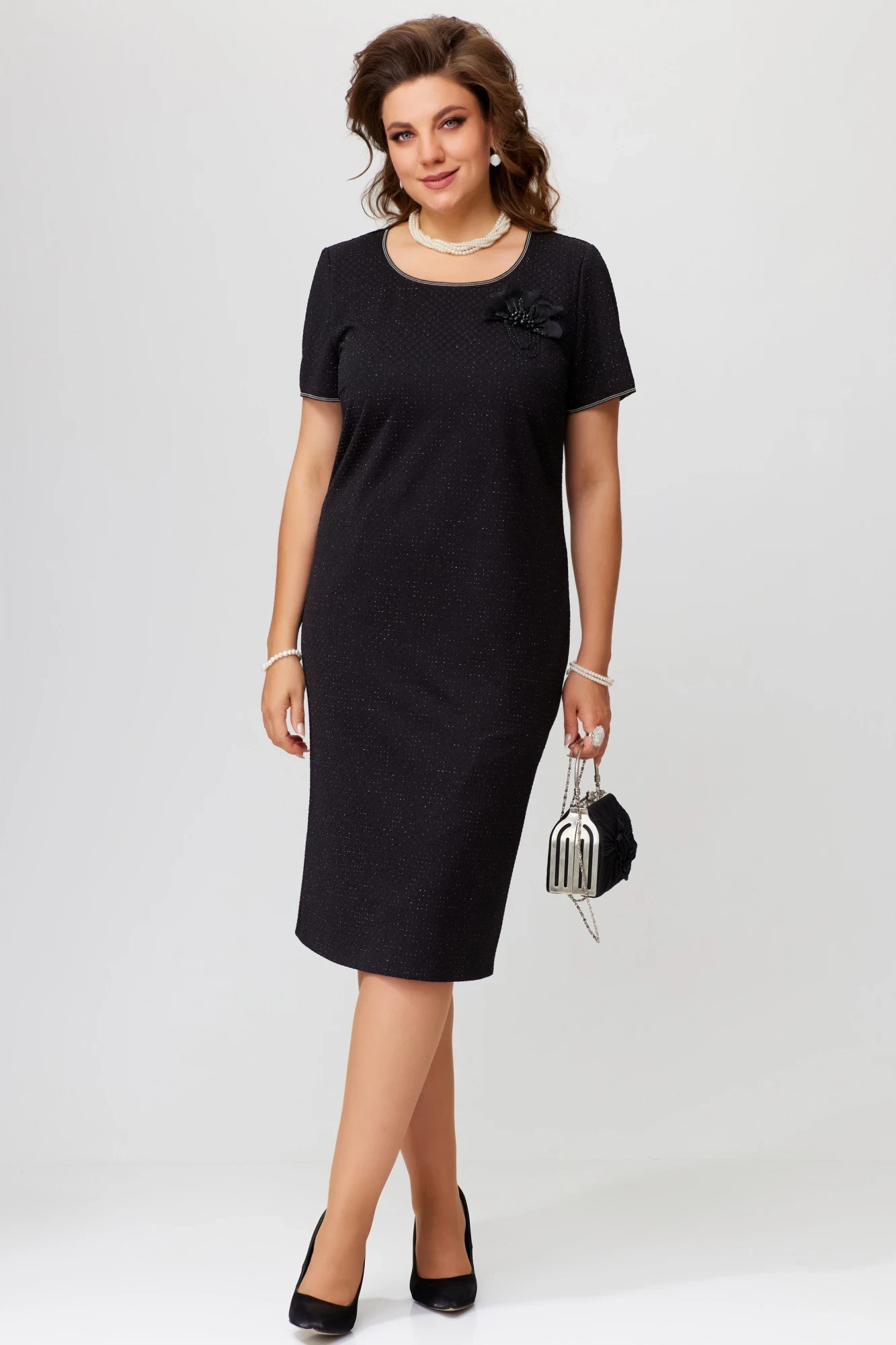 Трикотажное платье выполнено из нарядного трикотажного полотна в горошки с тонкой золотистой люрексовой ниточкой. Платье полуприлегающего силуэта, по полочке нагрудная выточка, в среднем шве спинки - потайная молния, по низу - шлица, горловина обтачена подкладной, в шок вставлена декоративная тесьма, рукав одношовный втачной, по низу рукава притачена декоративная тесьма.