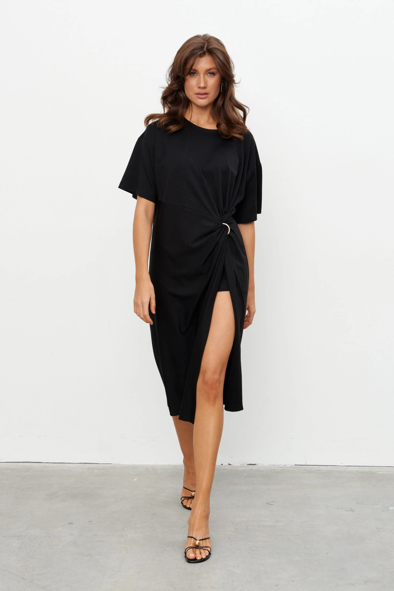 Комплект из трикотажного полотна состоящий из платья-туники и шорт. Платье со спущенным плечом и рукавом до локтя, горловина отделана эластичной бейкой. Сбоку, чуть ниже талии, конструктивный элемент в виде узла, переходящего в высокий разрез. Через узел протянуто декоративное золотое кольцо. Шорты плотно прилегающие на резинке по поясу.