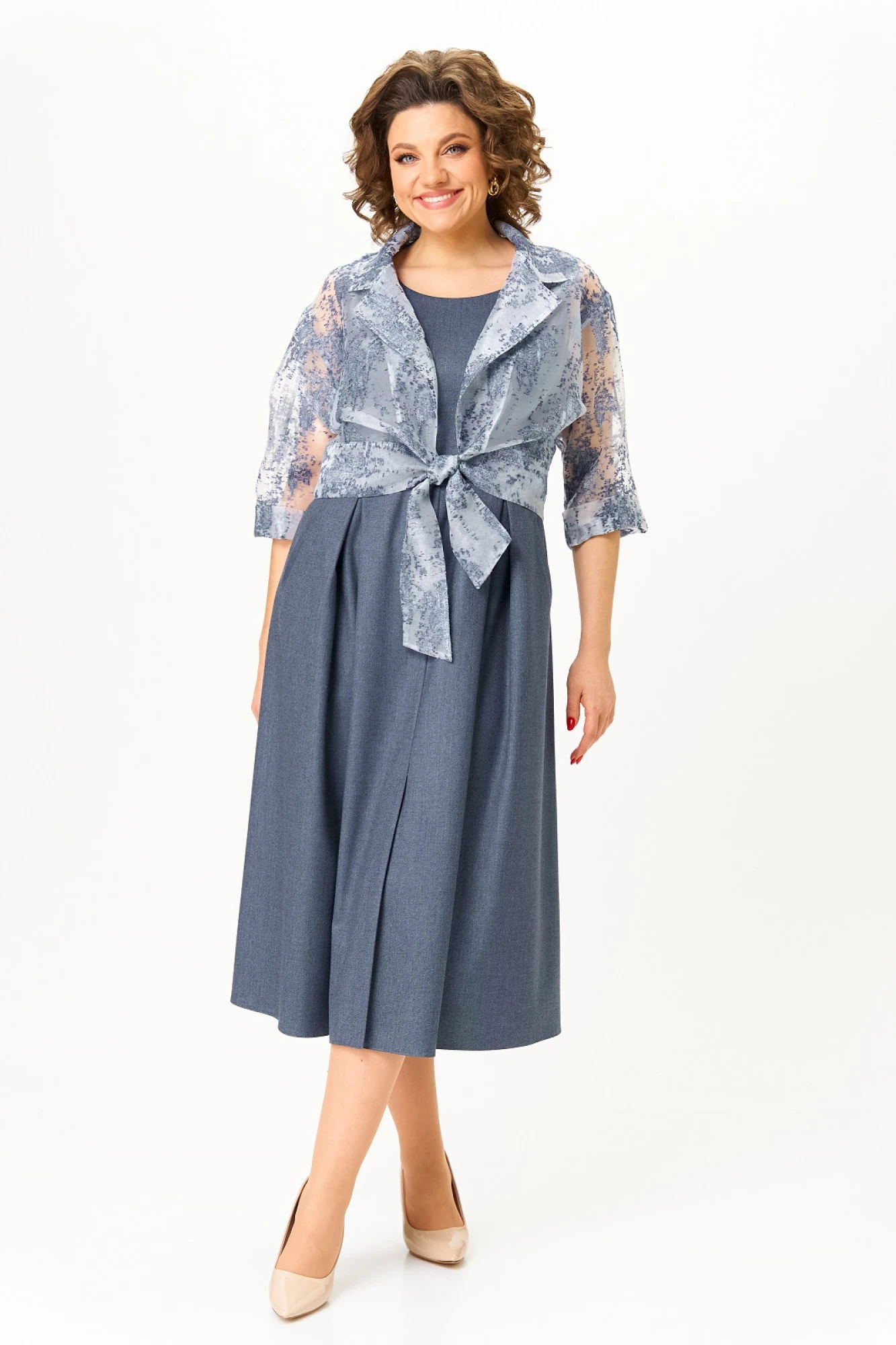 Нарядный женский комплект, состоящий из платья и блузона. Платье из мягкой костюмной ткани с добавлением вискозы, расцветка и фактура ткани создает эффект джинса, удлиненное, без рукавов, отрезное по линии талии, линия талии слегка завышена, юбка расширена за счет встречных складок по переду и спинке, по центру переда юбки шлица и прорезные карманы с листочками вырез горловины круглый, по спинке в среднем шве застежка на потайную молнию. Блузон из прозрачной ткани с джинсовым рисунком, укороченный, без застежки, на широком поясе, завязывающимся на бант, воротник пиджачного типа, рукав 3/4 с отварачивающимся манжетотм.