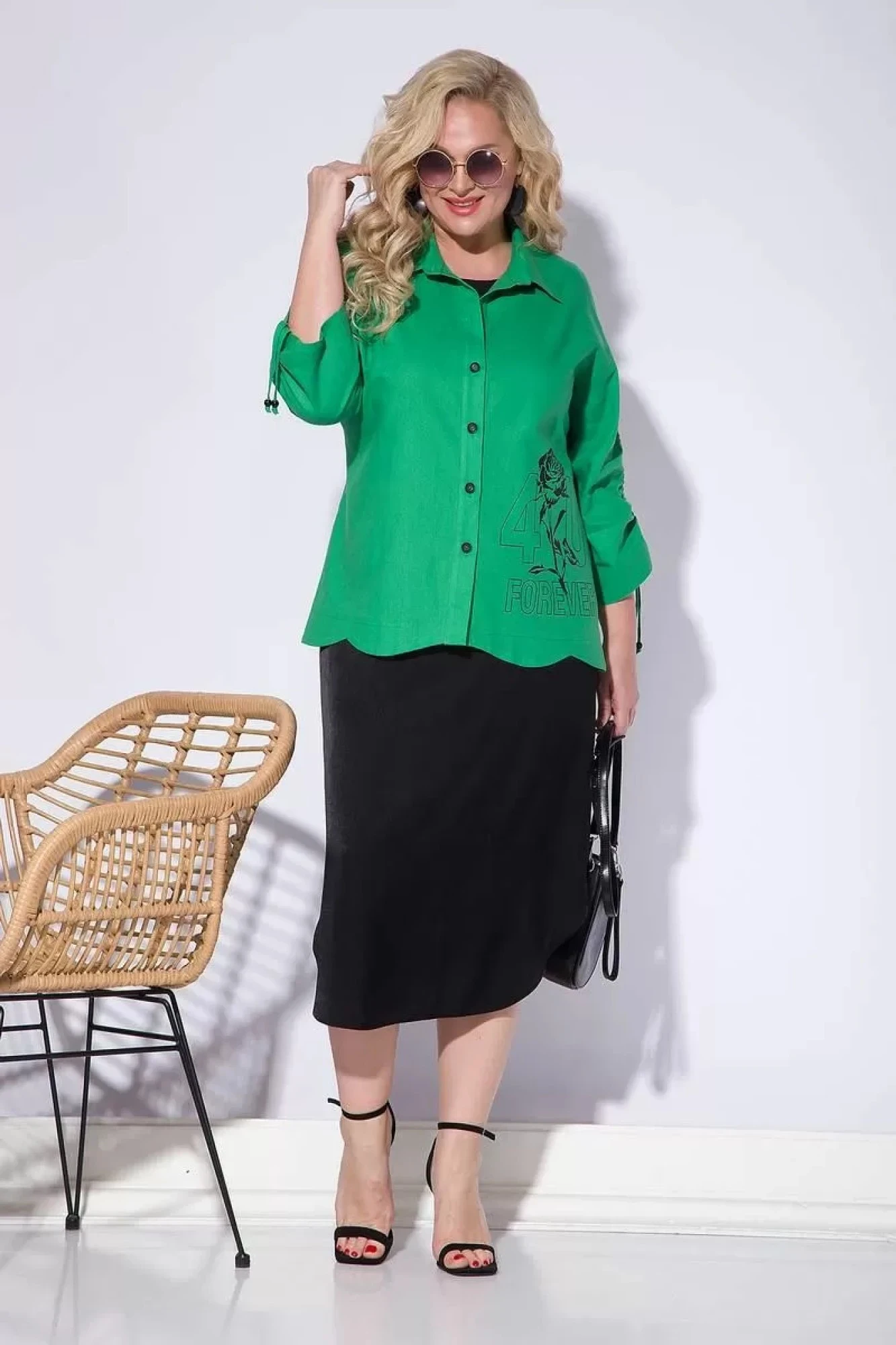 Оригинальная модель в стиле casual, состоит ил льняной рубашки и базового комфортного платья. Модель рубашки со с пущенной линией плеча, с отложным воротником на стойке. Застежка центральная, на петли и пуговицы. Рукав рубашечного типа, длиной ¾-ти с эффектной кулисой на сборку по центру. Спинка прямая. Модель с фигурным низом. Изюминкой модели служит ассиметричная печать накат контрастного цвета. В комплекте идет базовое платье из вискозы, прямого силуэта с овальной линией низа. Платье по типу – майки, без рукавов. Вырез горловины округлый! Утилитарная, эффектная модель для жаркого лета! Составляющие данного комплекта можно легко миксовать с другими вещами из вашего гардероба!
