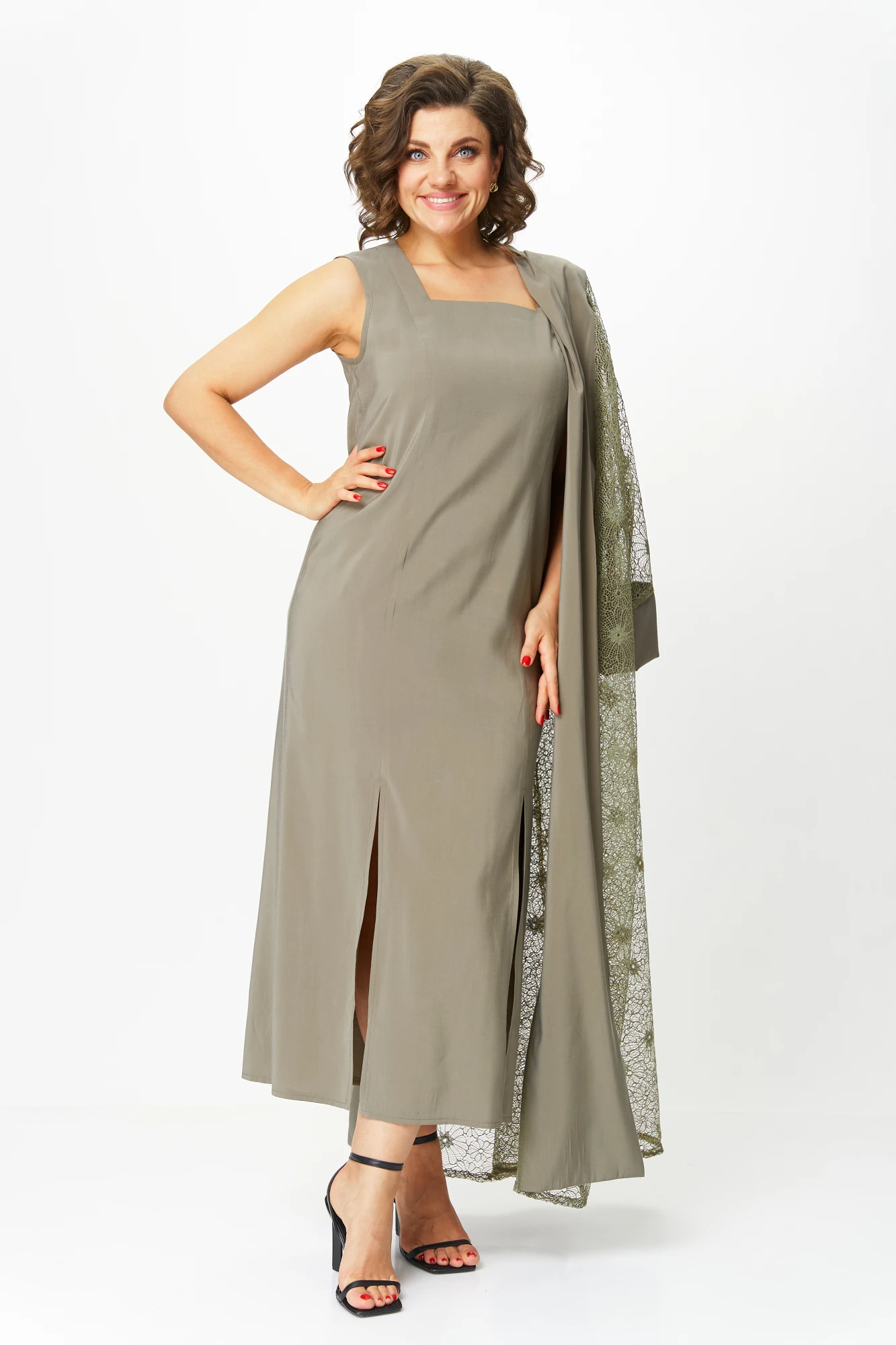 Нарядный и эффектный женский комплект, состоящий из двух предметов: длинного струящегося кардигана из кружева, который надевается поверх платья прямого полуприлегающего силуэта , с симметричными разрезами по переду. Кардиган длинный, декорирован длинными завязками, короткий втачной рукав.