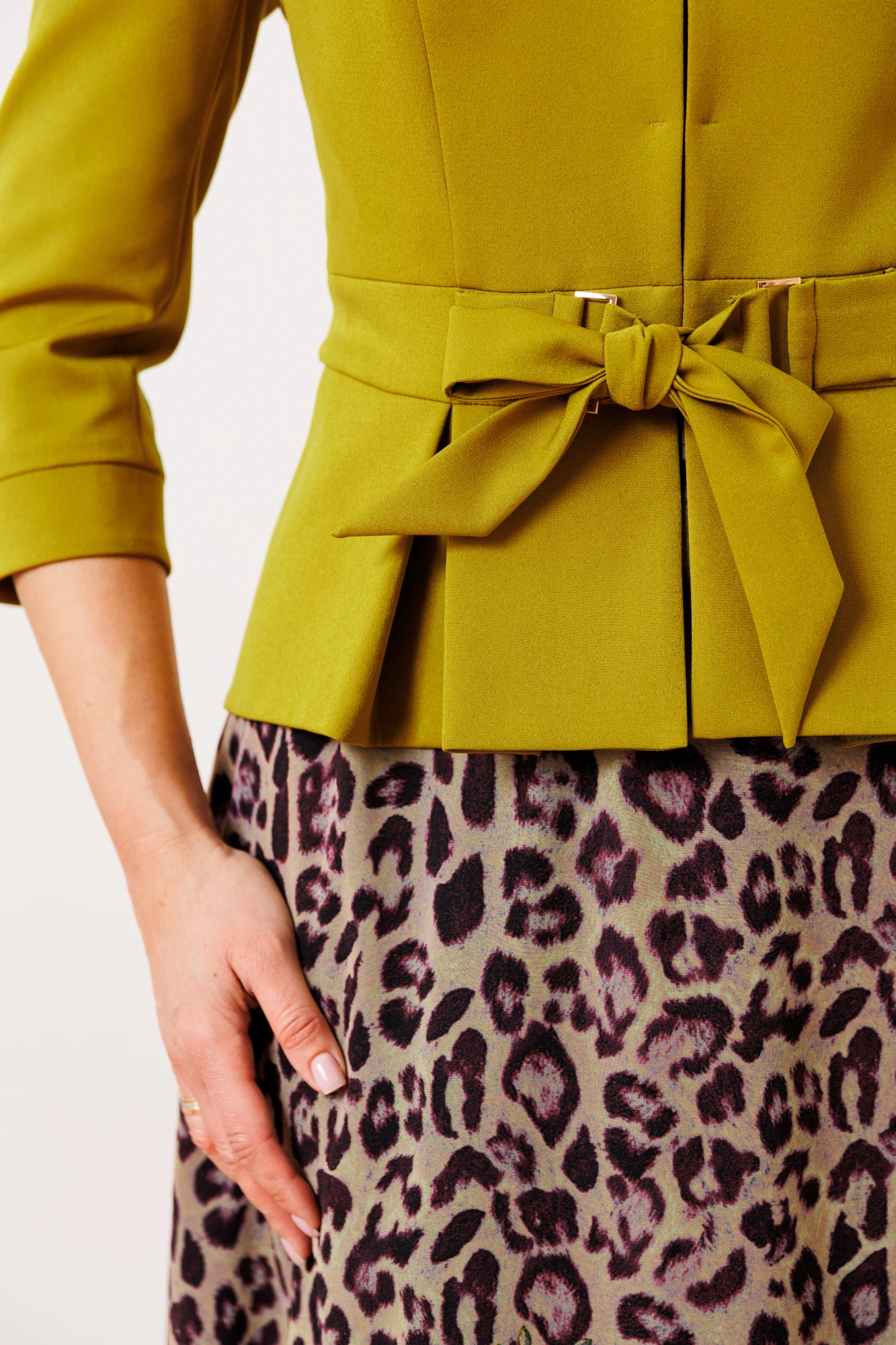 Женственный комплект с ультрамодными принтами. Состоит из жакета и платья. Жакет приталенного силуэта с застежкой встык на декоративные крючки. Воротник пиджачного типа. По переду вертикальные рельефы из проймы. В области талии отрезная планка, переходящая в пояс-завязку через декоративные рамки. По низу переда и спинки фигурная баска со складками. Рукава втачные двухшовные, с манжетой по низу из отделочного материала. Платье приталенное, отрезное по линии талии. Юбка расширенная к низу. Лиф с нагрудными вытачками. Горловина круглой формы. Рукав короткий, втачной
