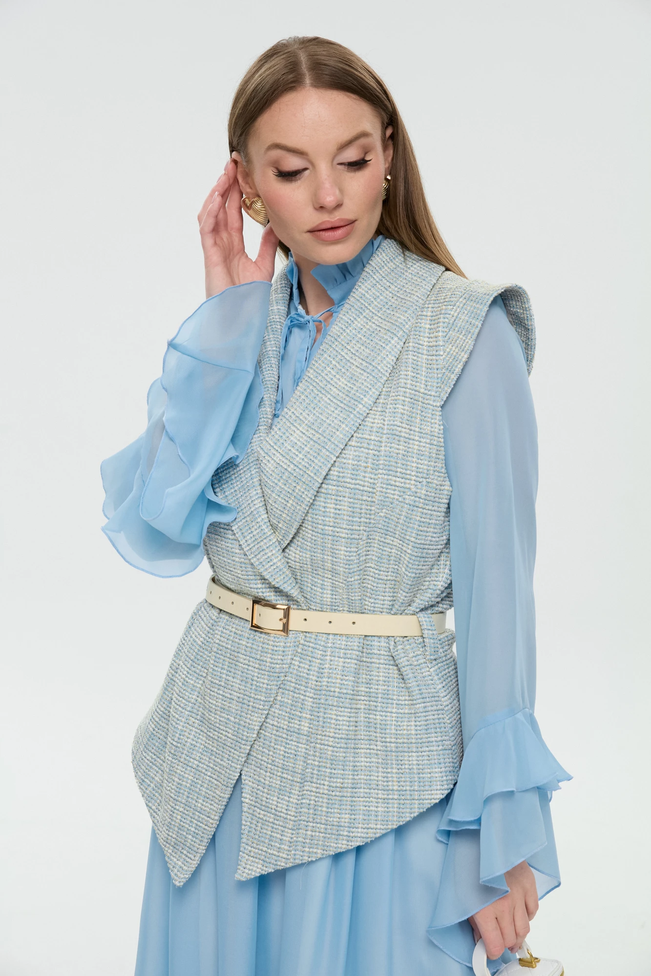 Костюм двухпредметный: состоит из платья и жилета. Платье макси свободного кроя с завышенной фигурной линией талии. Горловина оформлена воротником-стойкой с завязками, верхний край украшен рюшей. Рукав втачной широкий с асимметричными воланами по низу. Изделие на подкладке. Низ юбки оформлен воланом. Жилет удлиненный свободного прямого силуэта, воротник пиджачного типа. Линия низа по переду и спинке фигурная ассиметричная. Короткий рукав-крылышко. Талия фиксируется съемным ремнем из экокожи, для которого в боковых швах оформлены шлевки. Ремень идёт в комплекте к изделию.
