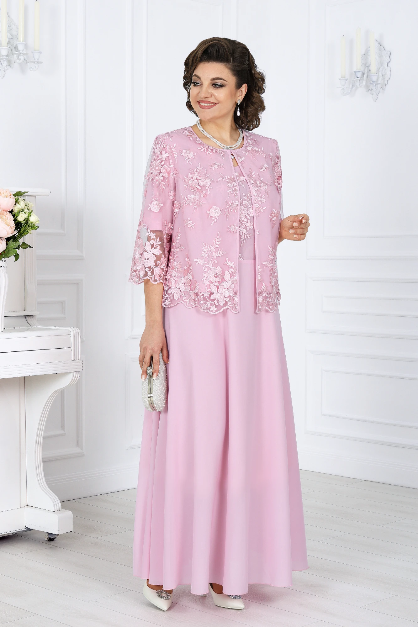 Роскошный женский костюм из платья и жакета — идеальный выбор для праздничного выхода, будь то свадьба, юбилей или любое другое торжество. Восхитительное сочетание воздушного шифона и изысканного гипюра придаёт образу неповторимую вечернюю элегантность. Этот костюм создан для того, чтобы вы чувствовали себя королевой на любом празднике!
