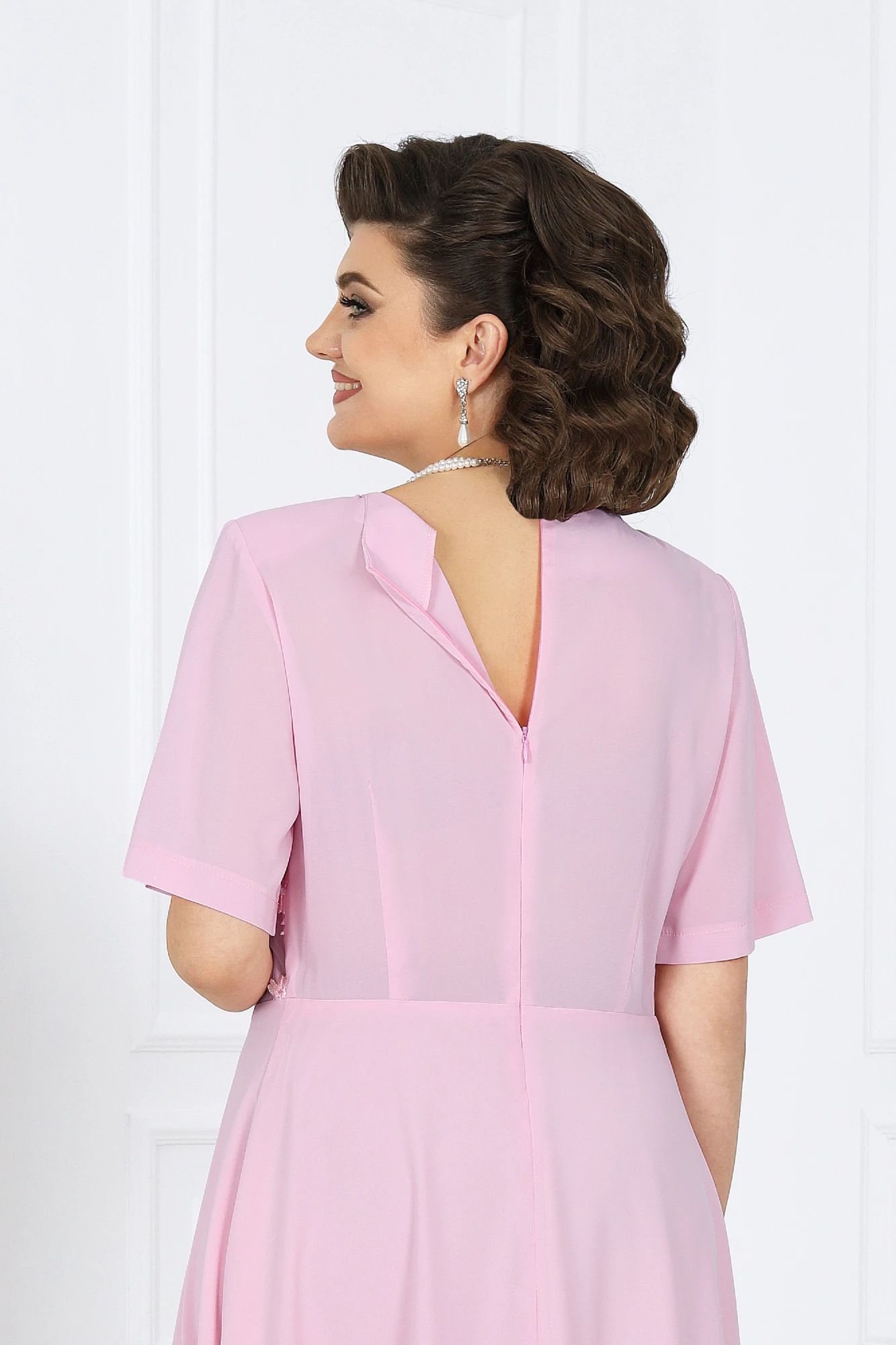 Платье приталенного силуэта, расклешенное к низу, выполнено из плательного стрейч-шифона и гипюра в цвет основной ткани. Модель с плечевыми накладками. Платье отрезное по линии талии: юбка на трикотажной подкладке; спинка лифа с талиевыми вытачками, перед – с нагрудными вытачками, направленными от пройм. Перед лифа двухслойный: нижний выполнен из шифона, верхний из гипюра. В среднем шве спинки обработана застежка на потайную тесьму-«молнию» (50 см). Горловина округлой формы по спинке и V-образная спереди. Рукав втачной, короткий, выполнен из шифона. Длина платья – 140 см, длина рукава – 28 см.