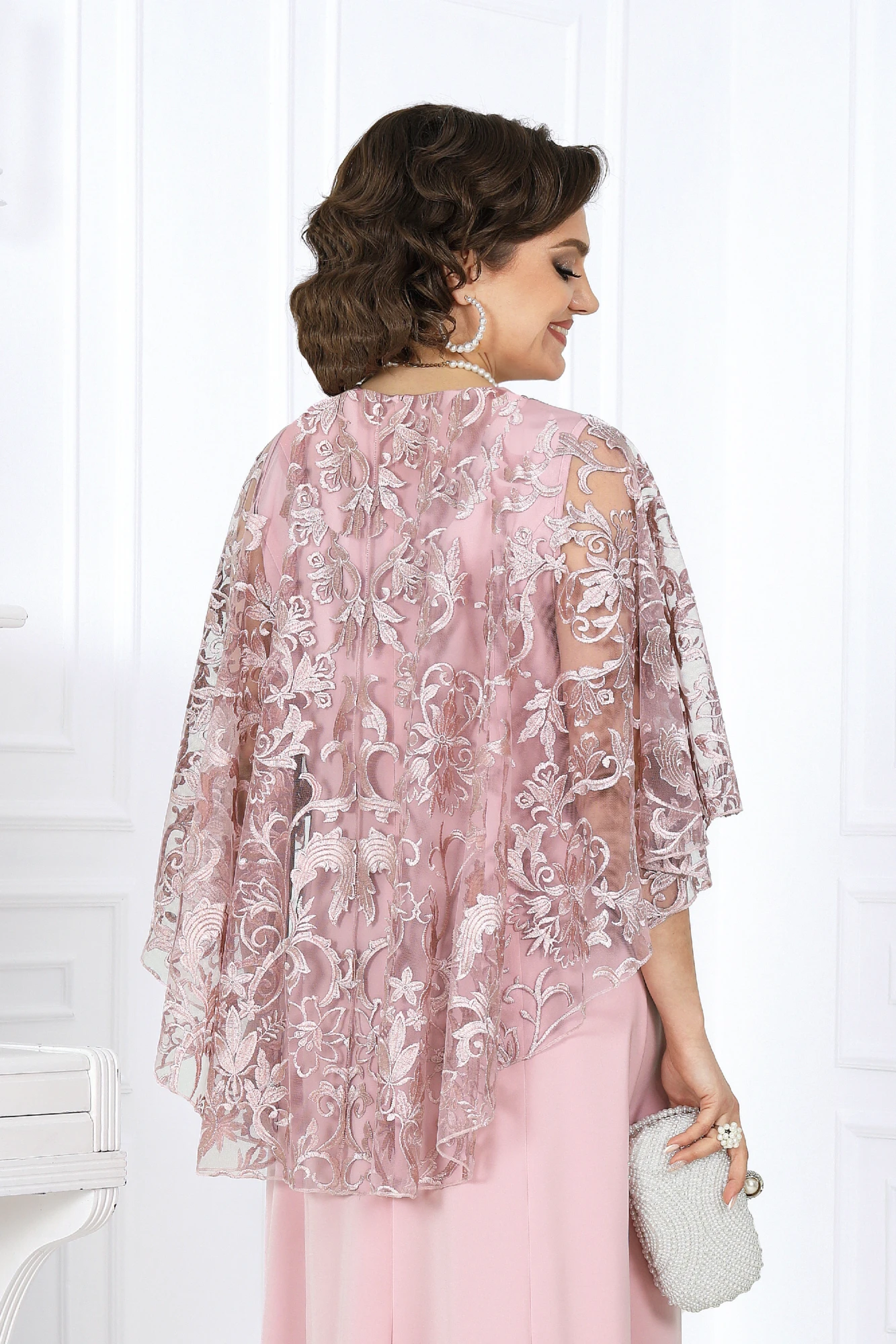 Окунитесь в атмосферу утончённой элегантности с этим нарядным костюмом, идеально подходящим для любого торжества — будь то праздничный вечер, свадьба, юбилей или светский выход. Наряд состоит из длинного платья и изящной гипюровой накидки, которые вместе создают роскошный и запоминающийся образ.