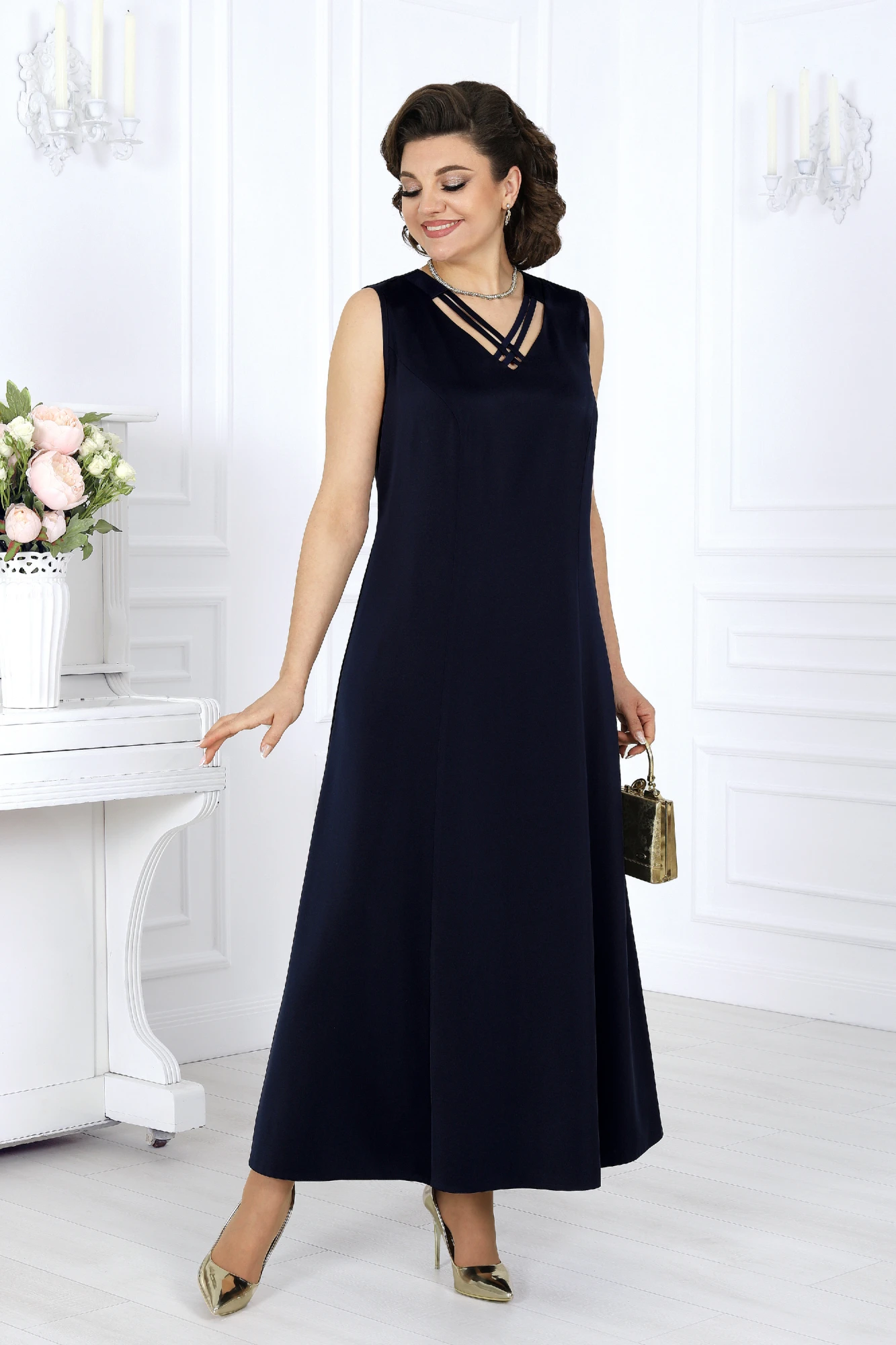 Платье женское полуприлегающего силуэта, расклешенное к низу, выполнено из плательного сатина. Модель без подкладки, без плечевых накладок. Перед и спинка с рельефными швами, направленными от пройм до низа. В среднем шве спинки обработана застежка на потайную тесьму-«молнию» (50 см). Горловина переда оформлена декоративным элементом с перемычками, переплетенными в уголке V-образного выреза. Платье без рукавов, проймы обработаны узкой косой бейкой из основной ткани. Длина платья – 130 см (50-58 р-р).