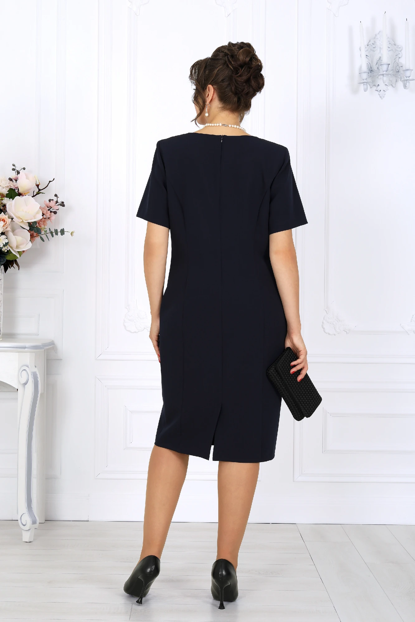 Платье полуприлегающего силуэта, выполнено из костюмно-плательной ткани. Модель на трикотажной подкладке, с плечевыми накладками. Перед и спинка с рельефными швами, направленными от проймы до низа. В верхней части среднего шва спинки обработана застежка на потайную тесьму-«молнию» (50см); в нижней части шва – шлица. Горловина округлой формы, спереди углубленная. Рукав втачной, короткий. Длина платья – 104 см; длина рукава – 25 см.