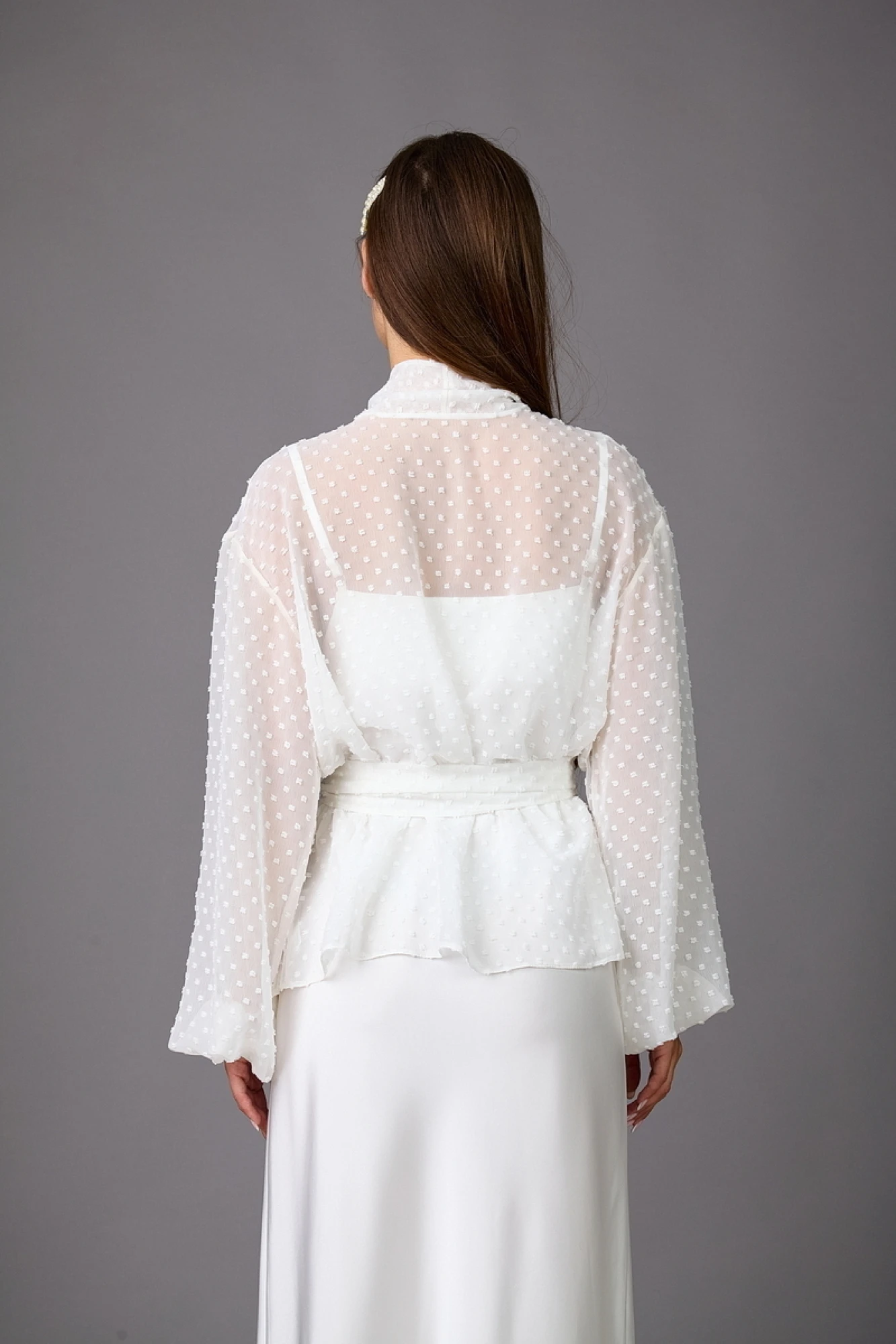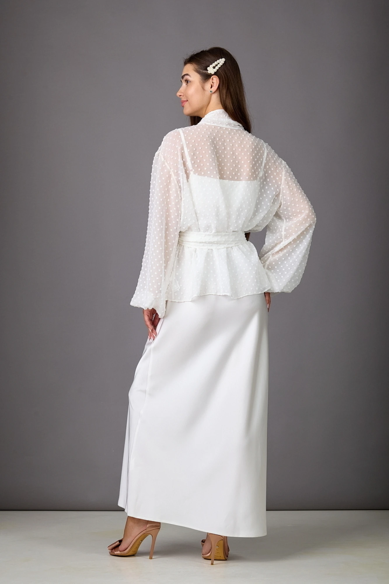 Комплект женский, состоящий из блузы и платья. Прозрачная блуза из шифона немного расширена к низу, с планкой по горловине и бортам. Рукава-балон. Завязывается на пояс. Платье-комбинация из плотного атласа. Крой выполнен по косой, что обеспечит великолепную посадку на фигуре. Бретели регулируемые.