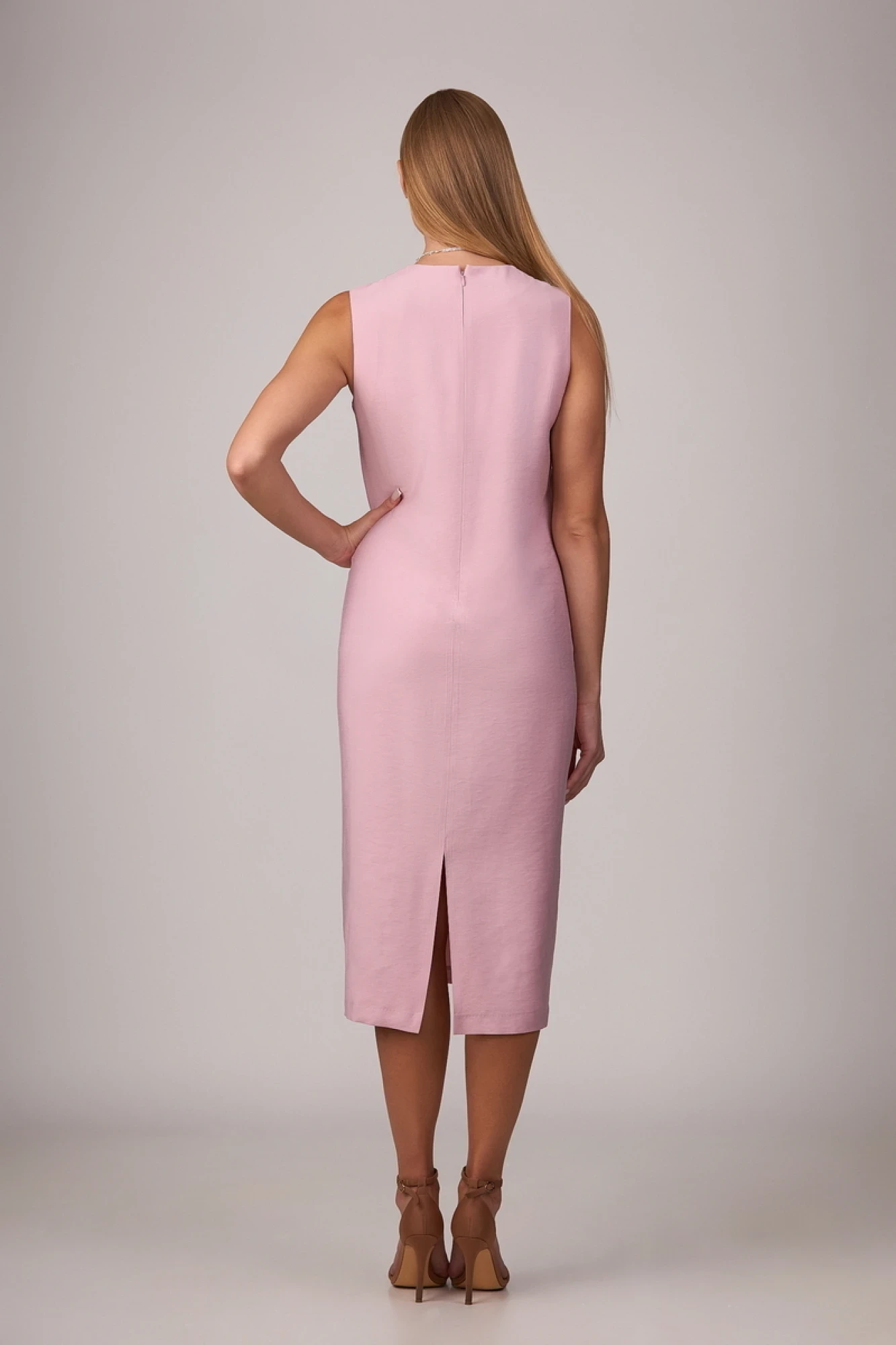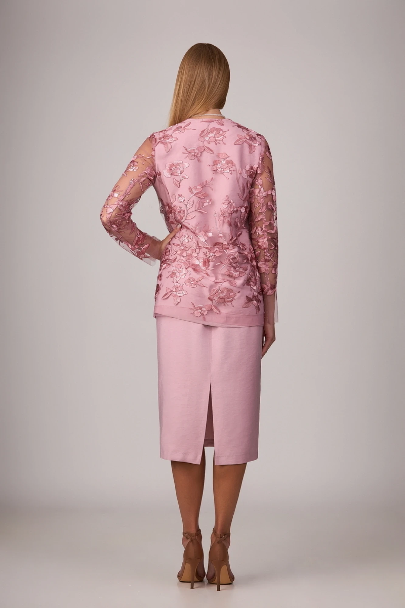Комплект из костюмной ткани на подкладке, состоящий из жакета и платья. Роскошный жакет, выполненный из гипюра и плательной ткани. Жакет прямого силуэта, с нагрудными вытачками, застегивающийся на навесную петлю и пуговицу. Рукава - длинные. Платье слегка приталенного силуэта без рукавов. Горловина и проймы обработаны обтачкой. Молния в среднем шве спинки. Шлица обеспечит свободу движения.