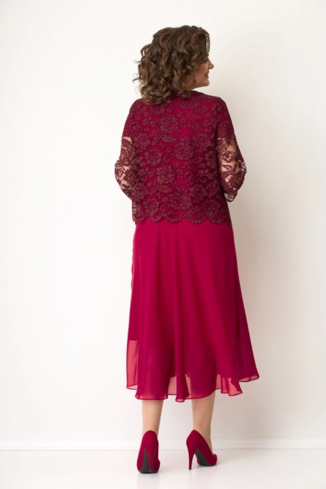 Комплект женский двухпредметный. Состоит из шифонового платья и гипюрового жакета. Платье отрезное по линии бедер. По полочке нагрудные вытачки, по спинке-талевые. По спинке потайная молния. Юбка изделия-полуклеш. Платье на трикотажной подкладке. Рукав крылышко. Жакет пошит из очень красивого гипюра-шитье, без застежки, фиксируется по горловине крючком. Отлетные детали полочки украшены стразами. Длина рукава ниже уровня локтя. Жакет свободного кроя. Комплект можно носить в ансамбле, а также самостоятельно. Длина рукава в жакете в 50р-48 см, длина жакета в 50р-51 см. Длина платья в 50р-121 см