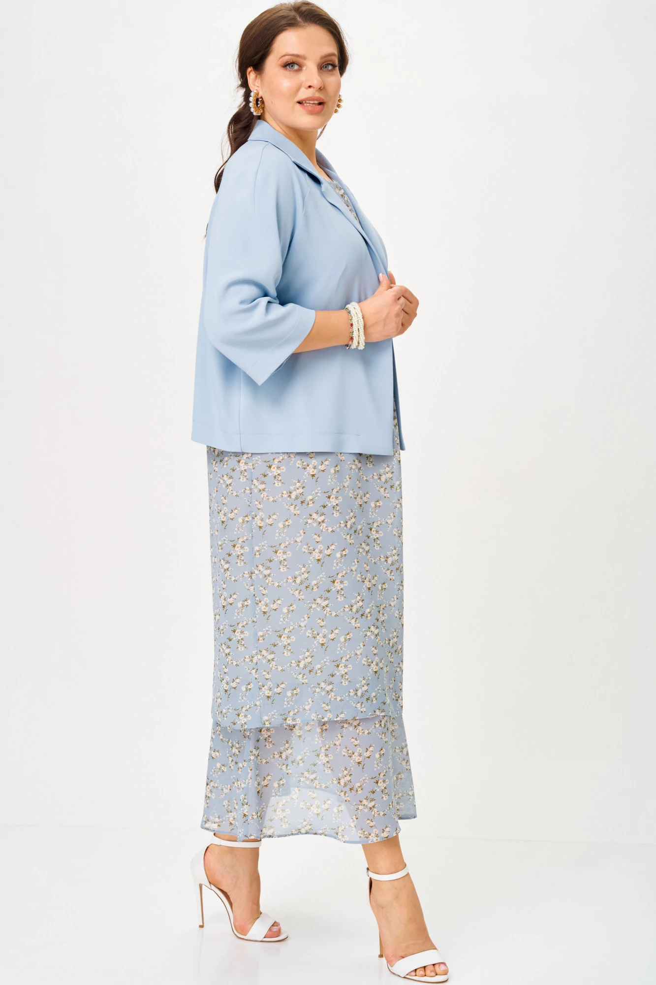 Мягкие линии в жакете подарят комфорт. Лёгкий и светлый наряд подчеркнёт женственность и подчеркнёт достоинства фигуры.
