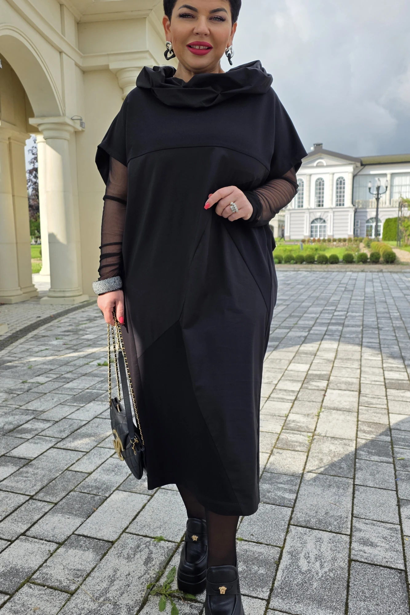 Комплект женский, двух-предметный, состоящий из платья и блузона. Если Вы ищете идеальное сочетание стиля и комфорта, вот идеальный выбор. Мы специально подобрали качественную и тактильно приятную ткань, которая хорошо держит свою форму, создавая ощущение легкости и свободы движения. Стильный комплект в духе концептуальной моды - лучший выбор для тех, кто не боится самовыражаться и приковывать к себе взгляды окружающих. Оригинальный асимметричный крой, помноженный на пластические свойства ткани подчеркнет все, что нужно подчеркнуть, и скроет все, что нужно скрыть. Платье ( состав: хлопок 75% ПЭ 20% эластан 5% ) свободного силуэта заужается к низу. Горловина округлой формы, с притачным воротником по форме «хамут» с декоративными защипа, создающими оригинальную форму, из отделочной ткани. По переду платья отрезная кокетка, геометрические подрезы с вставками из отделочной ткани. Сочетание разных фактур ткани чёрного цвета создаёт стильный образ на каждый день. Спинка в платье со средним швом. В боковых швах платья карманы. Блузон (состав: 100%пэ) прямого силуэта с округлой формой горловины. Рукав втачной, длинный.
