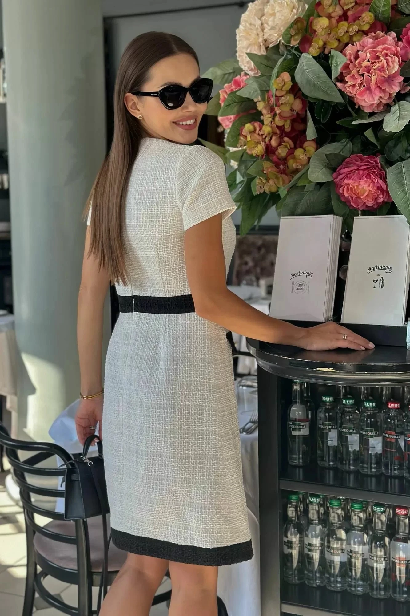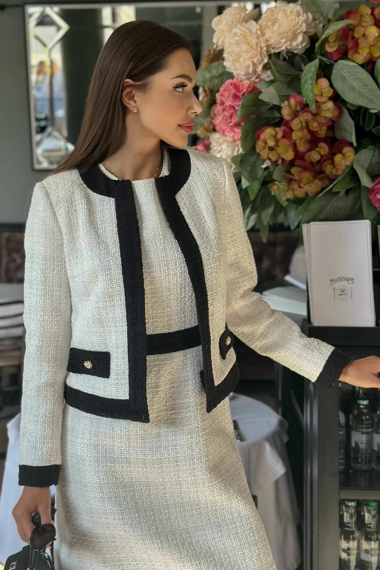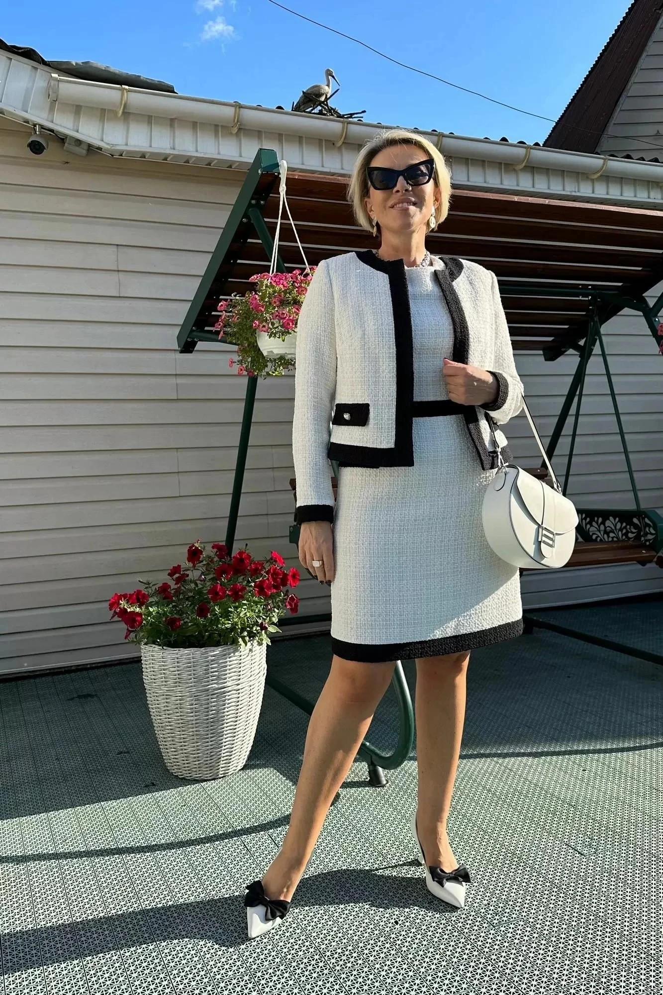 Твидовый костюм в белом цвете с контрастной отделкой - это элегантное сочетание классики и современности. Этот костюм идеально подходит для деловых встреч, официальных мероприятий и в повседневной жизни.