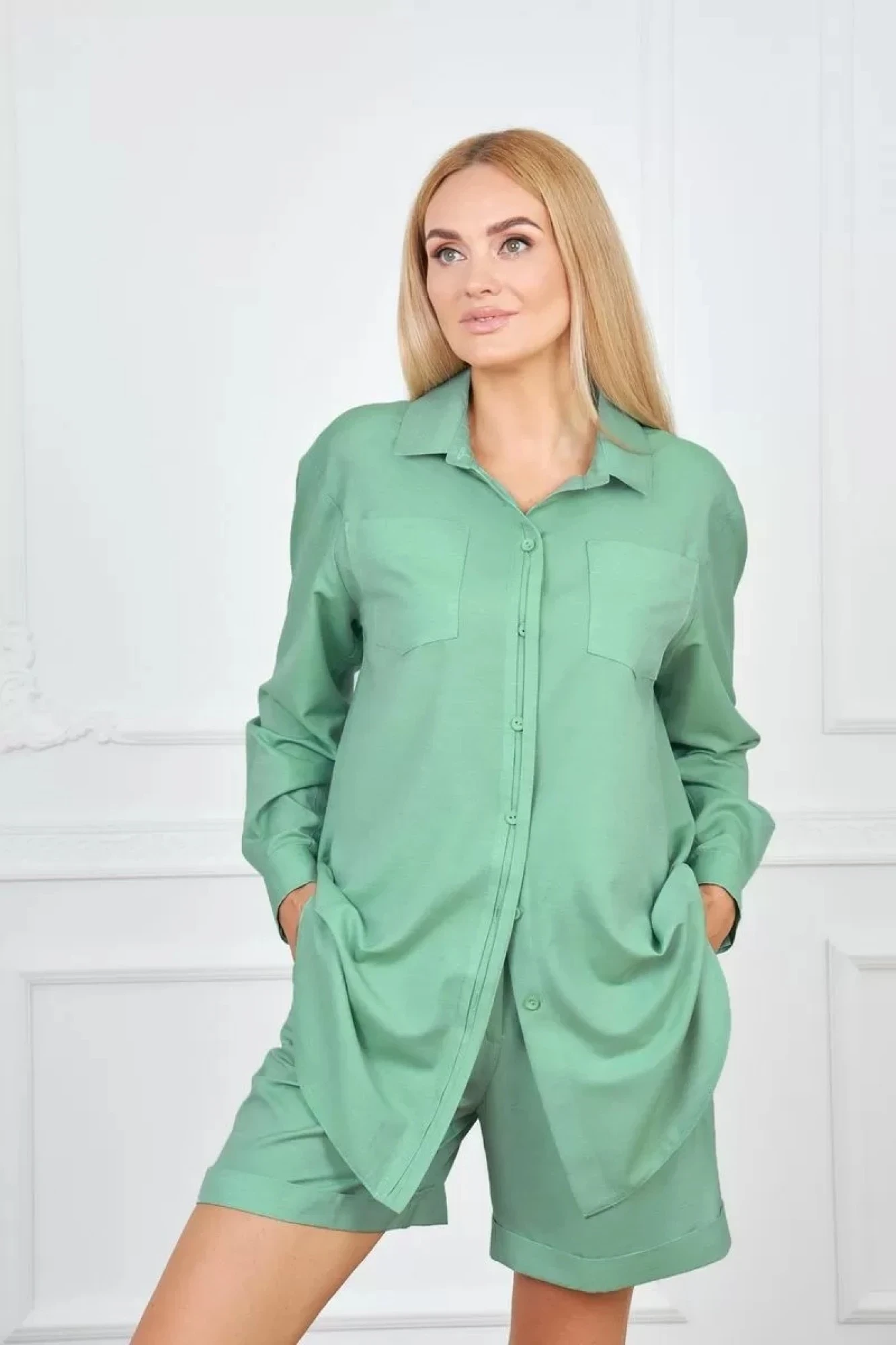 Комплект женский,состоящий из блузки и шорт.Блузка удлиненная ,ниже линии бедер ,свободного покроя,с рубашечным рукавом на манжете по низу.Шорты свободные ,спереди на поясе , по спинке -с эластичной тесьмой,с боковыми карманами, по низу шорт -манжеты отложенные.