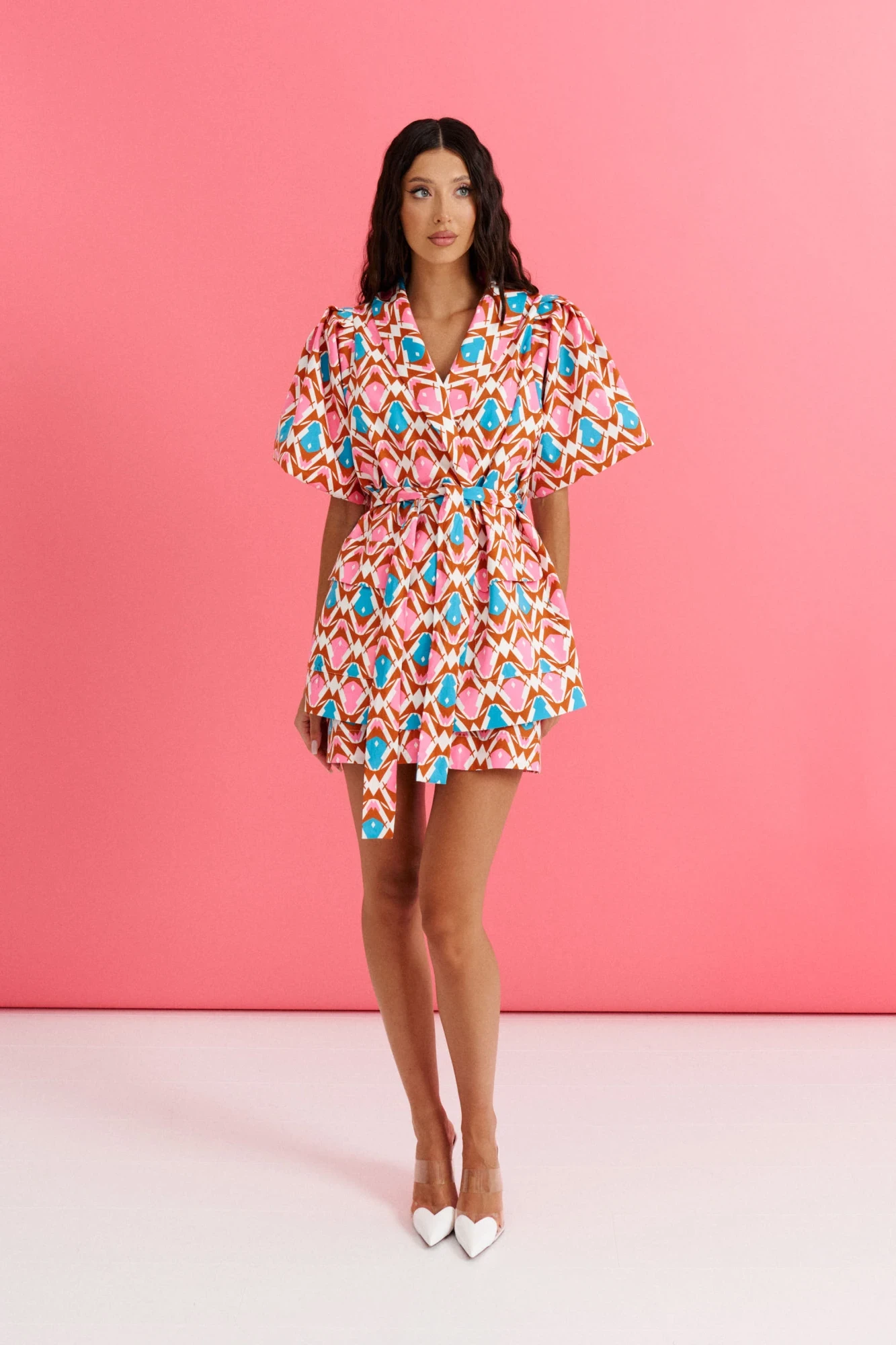 Комплект состоит из жакета и шорт выполнен из ткани с абстрактным принтом. Характеристики: Жжакет прямого кроя, подкладка, отложной воротник, застежка центральная на петли пуговицы, рукав втачной объемный , по линии талии нашиты шлевки, в комплекте пояс из ткани основного изделия, по переду крупные функциональные карманы с клапаном. Длина по спинке 71 см, длина рукава 32. Шорты прямого кроя, пояс стабильный, застежка пуговичка молния, в боковых швах карманы. Длина 43 см.
