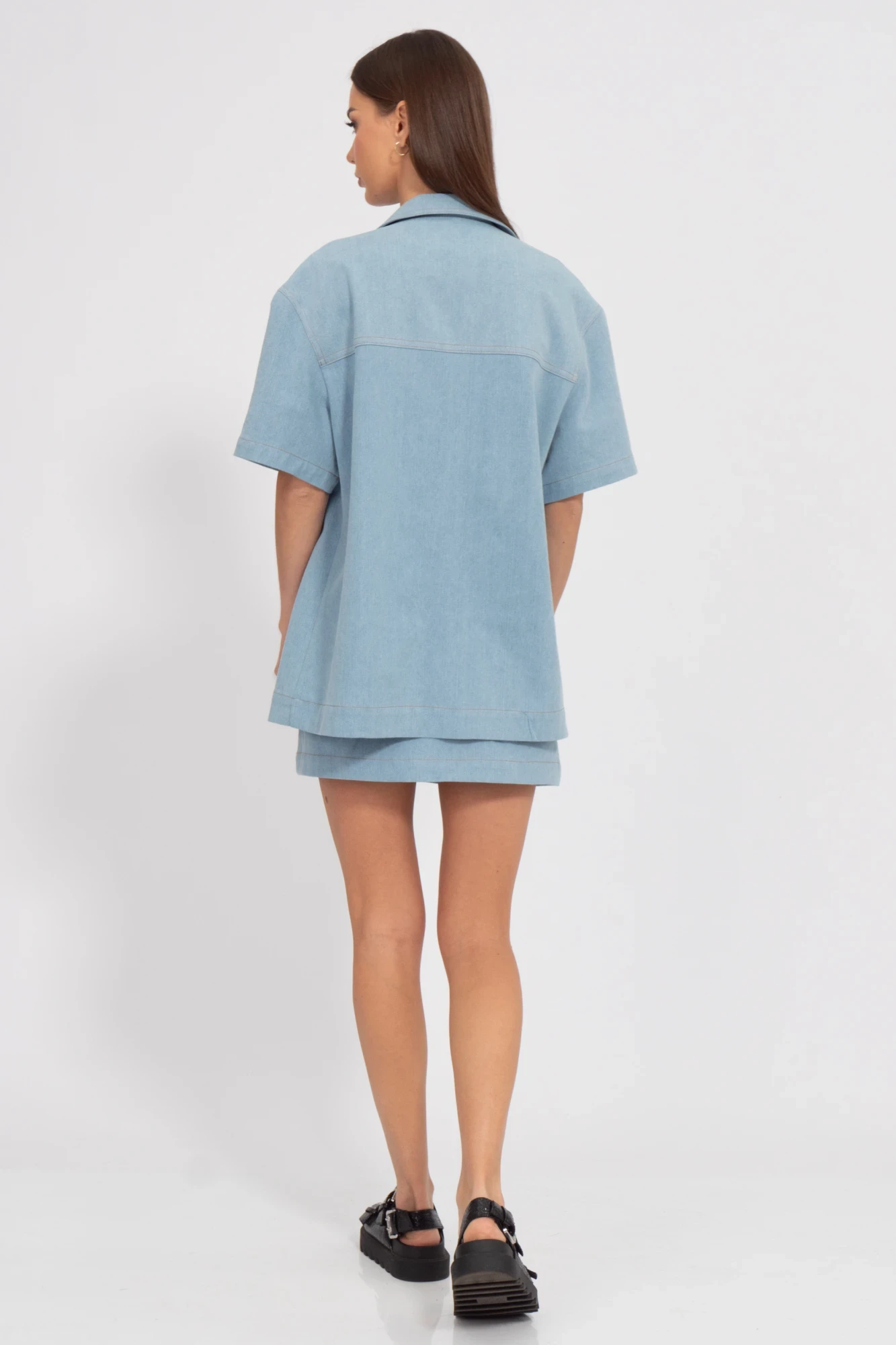 Представляем вашему вниманию стильный и универсальный костюм, состоящий из джинсовой блузы и мини-юбки. Этот комплект идеально подойдёт для создания разнообразных образов: от повседневных до нарядных. Блуза выполнена из высококачественного денима, который обеспечивает комфорт и долговечность. Она имеет свободный крой, что позволяет сочетать её с различными аксессуарами и обувью. Мини-юбка прекрасно сочетается с блузой и дополняет образ, делая его современным и актуальным.