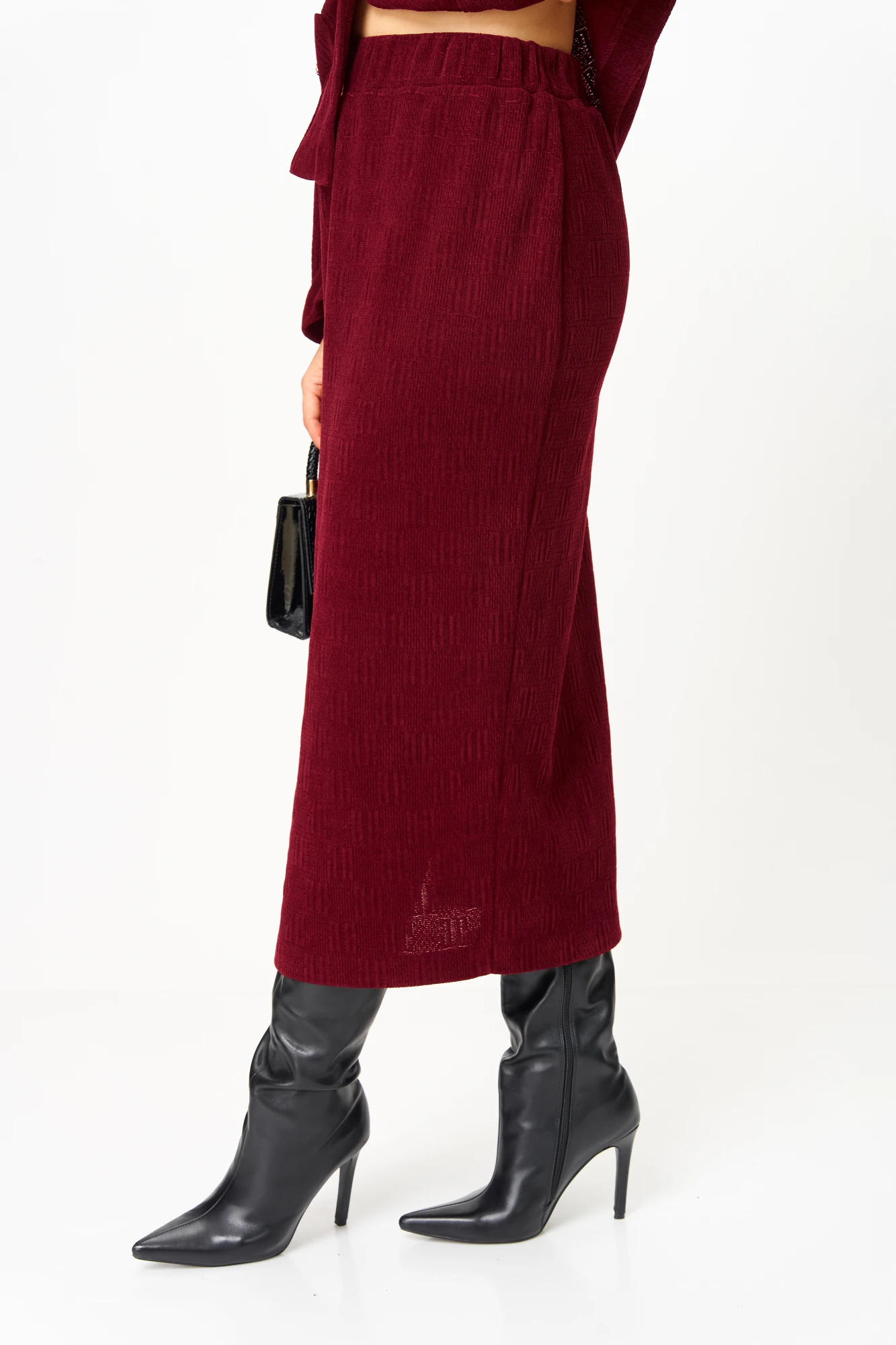 Трикотажный женский костюм из структурной ткани. Жакет прямого силуэта переду центральная застежка на 3-и петли и пуговицы и потайные кнопки. По переду накладные карманы декорированные цепью и застежкой на петлю и пуговицу. Спинка со средним швом без особенностей. Рукава втачные двухшовные. Юбка прямая длиной миди без подкладки. По правому боковому шву разрез. Для максимально комфортной посадки по поясу эластичная резинка.