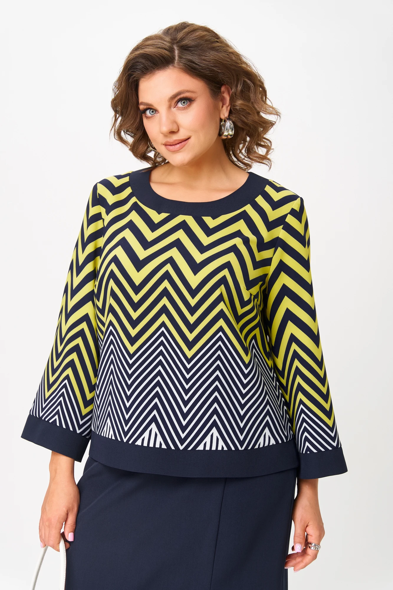 Стильный и гармоничный костюм состоит из блузки и юбки. Геометрический принт блузки притягивать к себе взгляд. Блузка прямого силуэта с нагрудными вытачками и декоративной отделкой по горловине, низу изделия и низу рукава. Рукав втачной одношовный. Спинка без особенностей. Юбка прямого силуэта со шлицей спереди по левой части. Пояс притачной с эластичной тесьмой по спинке, что обеспечивает максимально комфортную посадку на любой тип фигуры.
