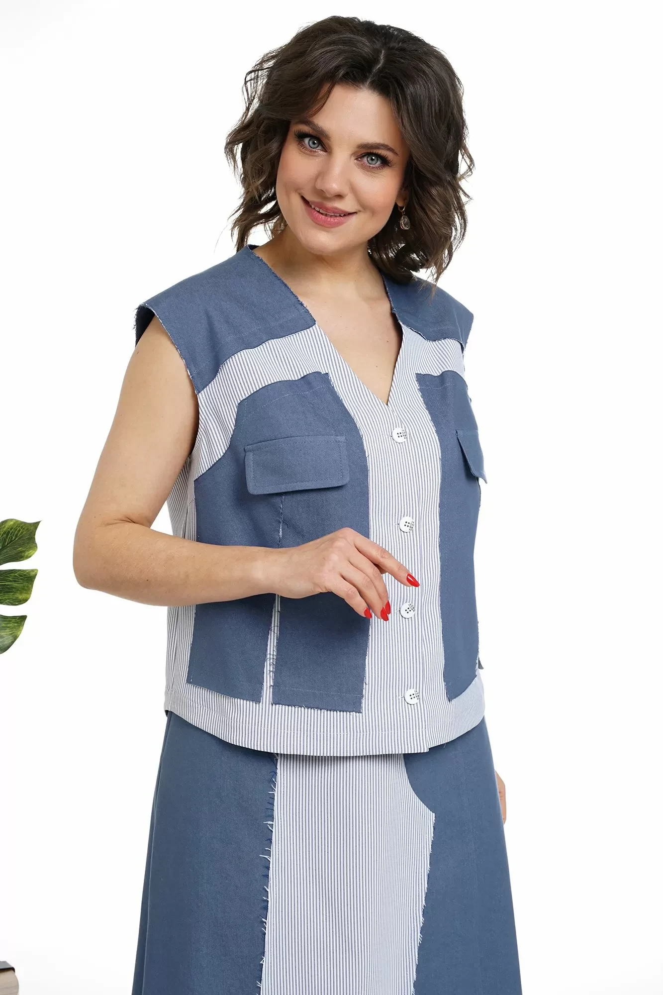 Жилет прямого силуэта, с центральной застёжкой на петли, пуговицы, с притачными кокетками, низ фигурной формы разноуровневым. Перед с нагрудными выточками, с отделочными деталями и декоративными клапанами. Срезы отделочной детали переда, кокетки переда и спинки с необработанными срезами.