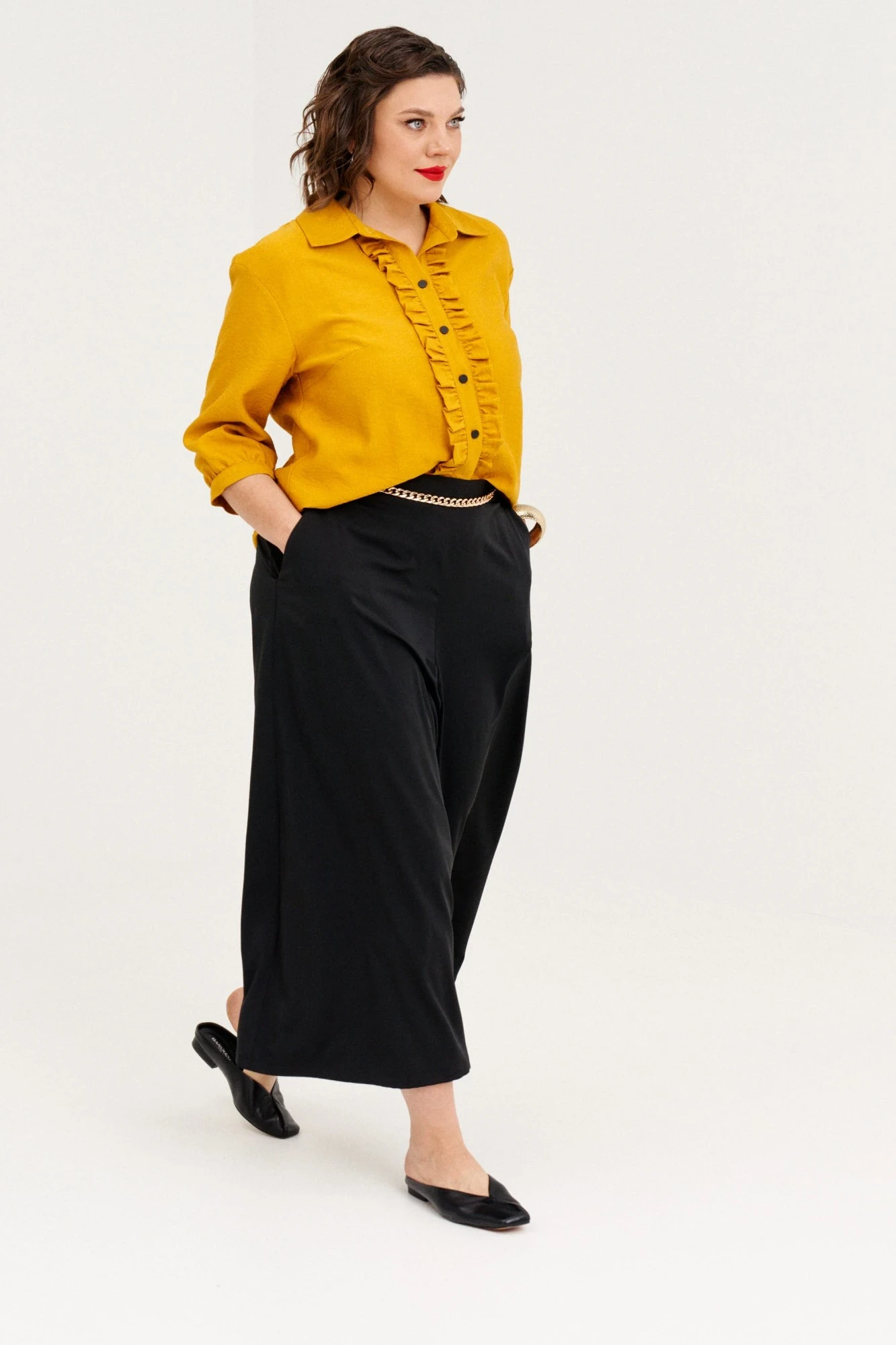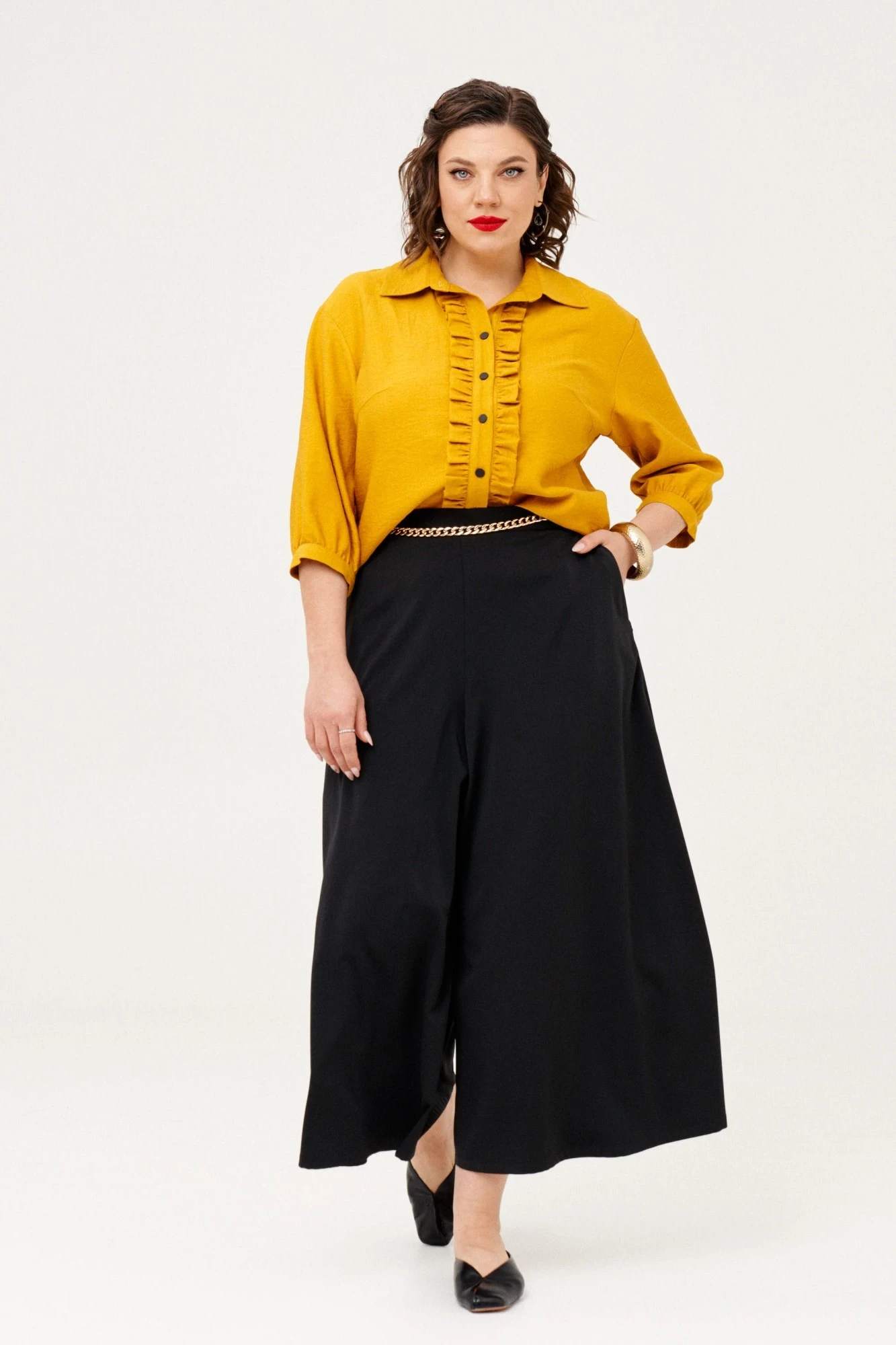 Эффектный женский комплект состоит из блузки и юбки-брюк. Блузка полуприлегающего силуэта со спущенной линией плеча. Рукав 3/4, свободный, закакнчивается манжетой без застежки.По переду застежка планка на петли и пуговицы, рюша. Воротник на отрезнойй стойке. Низ блузки фигурной формы. Юбка-брюки расклешена от бедра. Пояс притачной, резинка застежка сбоку на потайную молнию.Внутренние карманы.Декоративное украшение по поясу(цепь).