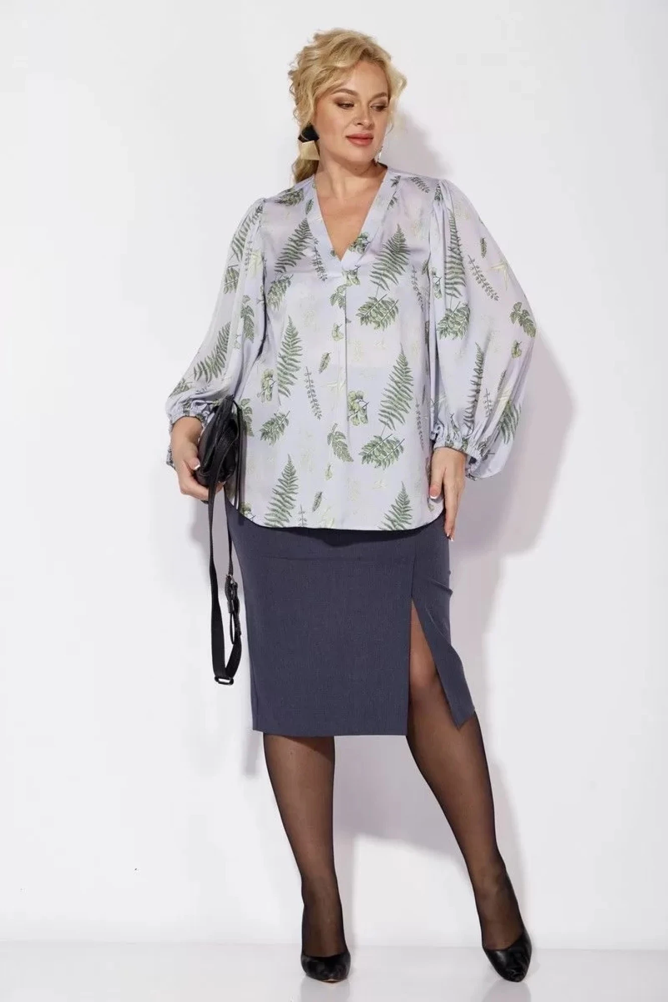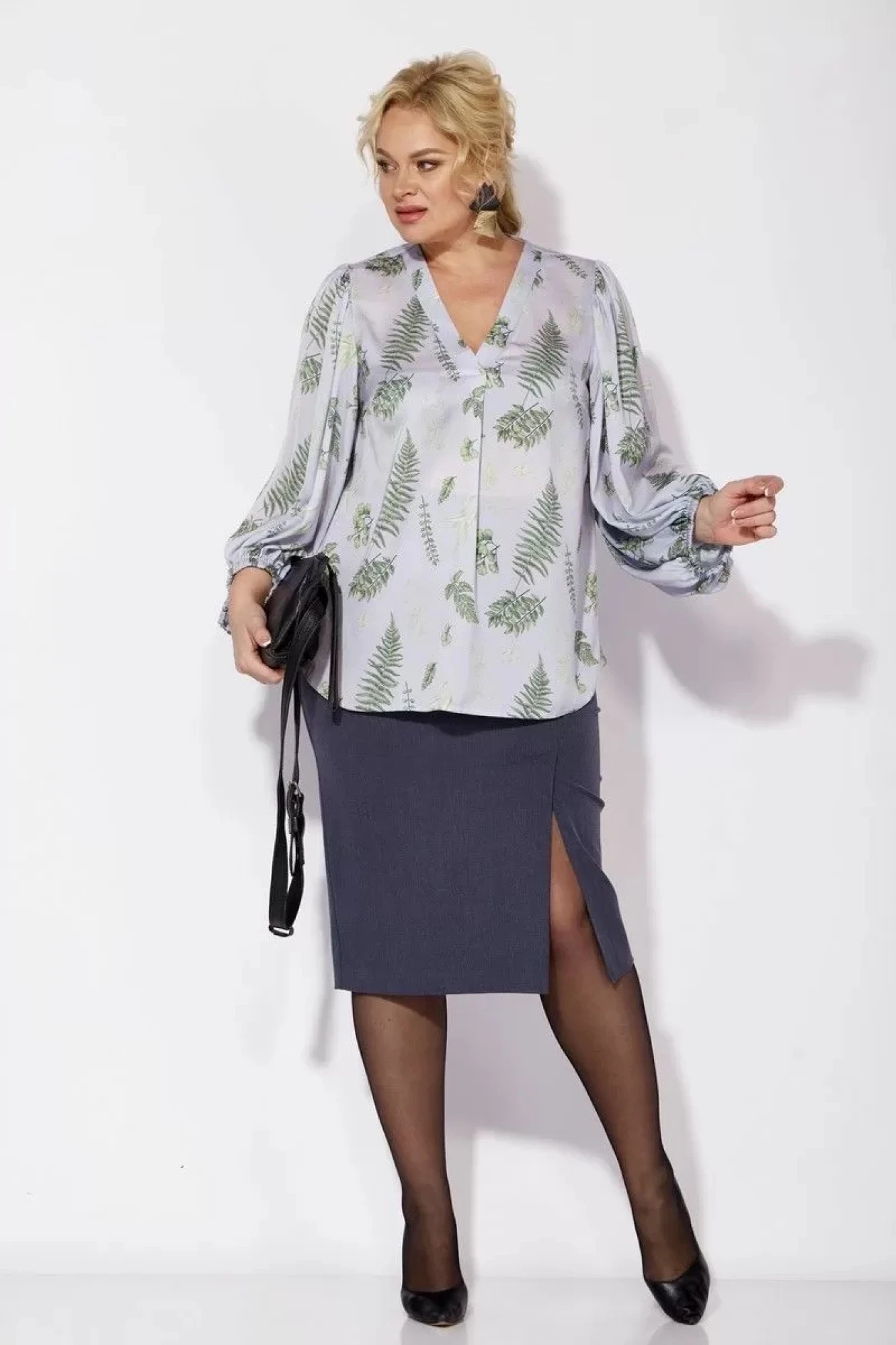 Комплект женский 2-предметный (блузка и юбка). Блуза из шифоновой ткани, полуприлегающего силуэта. По полочке идет нагрудная вытачка из бокового шва. Вырез V-образной формы с планками и складкой по центру. По спинке средний шов, рукав объемный, по окату сборка. Низ рукава фигурный, на резинке. Юбка зауженная к низу, по полочке по линии колена - шлица. По спинке: средний шов, молния, пояс отрезной с резинкой.