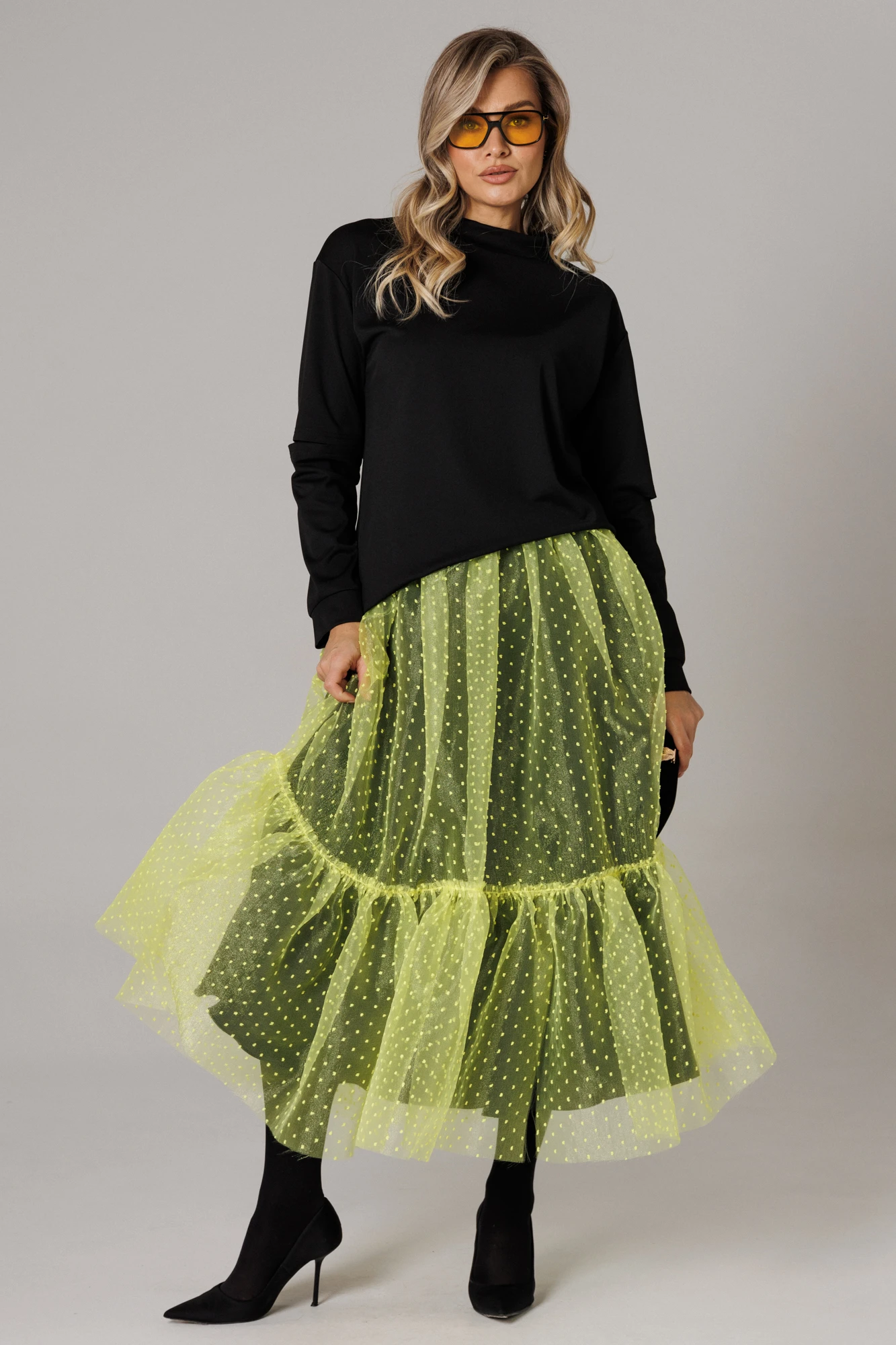 Оригинальный женский комплект от бренда Anastasia, идеальный для любого случая. Этот костюм сочетает в себе элегантность и комфорт, что делает его подходящим как для повседневной носки, так и для праздничных мероприятий. Джемпер оверсайз из трикотажного полотна. Прямого силуэта со спущенным плечом. Воротник-стойка. По рукаву идет подрез с разрезом. Низ рукава и низ джемпера - на манжете. Джемпер лекго сочетается с любыми низами: брюки, джинсы, юбка. Юбка макси из 2-х видов ткани: верх с отрезным валаном из органзы, подкладка юбка солце из шифона. Пояс на декоративной резинке. Фасон универсален, а использование резинки на поясе повышает комфортность носки, позволяя юбке адаптироваться под индивидуальные особенности фигуры. Юбку легко сочетать с различными верхами: топ, блузка, футболка, кружевной жакет, свитер или жакет из тексиля - все это позволит создавать различные образы на разные случаи. Длина по спинке 68см. Длина рукава (с манжетой): 60см. Длина юбки: 90 см