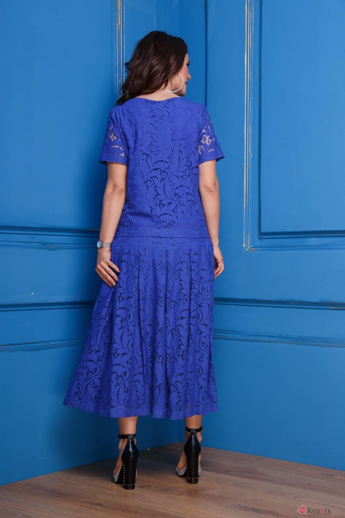 Комплект женский, 2-х предметный (блуза,юбка). Комплект из кружева синего цвета: подкладка и нижняя часть блузы из текстильной ткани,также синего цвета. Блуза,полуприлегающего силуэта,состоит из двух частей: верхней и нижней. Перед и спинка блузы-цельные. По переду-нагрудные вытачки с пройм и талиевые вытачки от низа блузы. Горловина блузы в форме "лодочки",обтачана нижней блузой. В области плеча горловина спинки заходит на полочку и фиксируется закрепкой. По пройме скреплен заход.По горловине переда и спинке прострочена отделочная строчка на 0,5см. В пройму вставлен короткий рукав. Низ блузы и низ рукава обметан и прострочена отделочная строчка на 2,5см. Низ нижней части блузы обметан и прострочена отделочная строчка на 0,5см. Юбка двухшовная,пышная,за счет складок. Юбка -средней длины и состоит из верхней-кружево и нижней-тонкая текстильная ткань. На верхней юбке переднего и заднего полотнищ заложены по 5 встречных складок с каждой части. К верхним срезам юбки притачана широкая кокетка. Задняя часть кокетки-со средним швом,в который вставлена потайная молния. К верхним срезам кокетки притачан узкий пояс,по боковым швам с резинкой. На заднем полотнище,по поясу-застежка на 1 петлю и на 1 пуговицу. Низ юбки обметан и прострочена отделочная строчка-2,5 см.