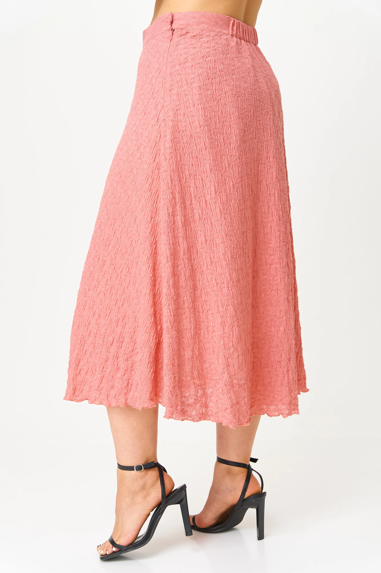Юбка А-образного силуэта, выполнена из однотонной ткани “жатка”. Юбка на притачном поясе с эластичной тесьмой и застежкой на петлю и пуговицу. В левом боковом шве обработана потайная молния.