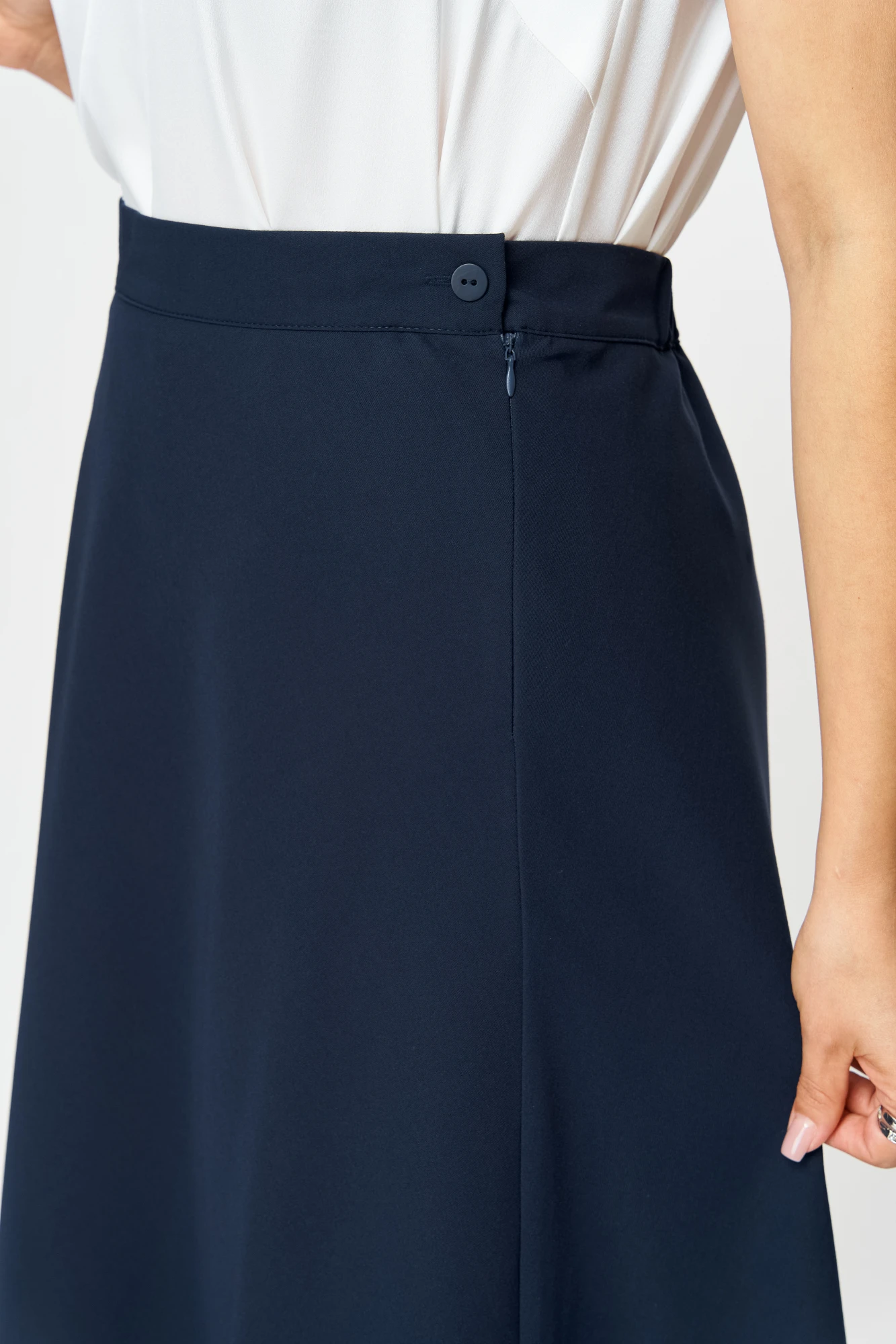 Юбка А-силуэта, длиной ниже колена.В левом боковом шве обработана застежка на потайную молнию. Юбка на притачном поясе с эластичной тесьмой по задней части пояса и застежкой на петлю и пуговицу по левому боковому шву.