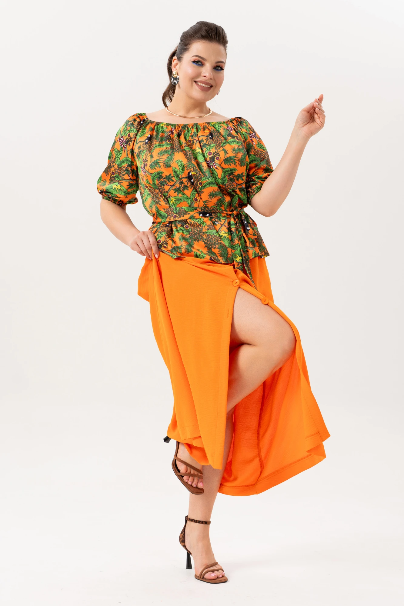 Комплект женский состоящий из блузки-туники и юбки. Блузка с удобными реглан рукавами 3/4 с эластичной резинкой на низу, что добавляет изделию изысканности. Горловина на эластичной резинке позволяет носить блузку с открытыми плечами, подчеркивая женственность образа. Съемный пояс подчеркивает талию, придавая фигуре еще большую выразительность. Юбка на поясе по полочке с двумя шлёвками, по спинке на резинке. юбка по переду на пуговицах, с боковыми наклонными карманами.